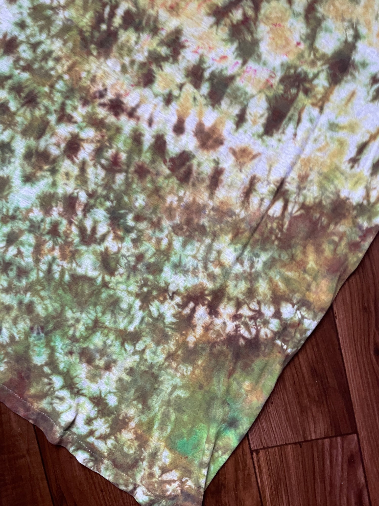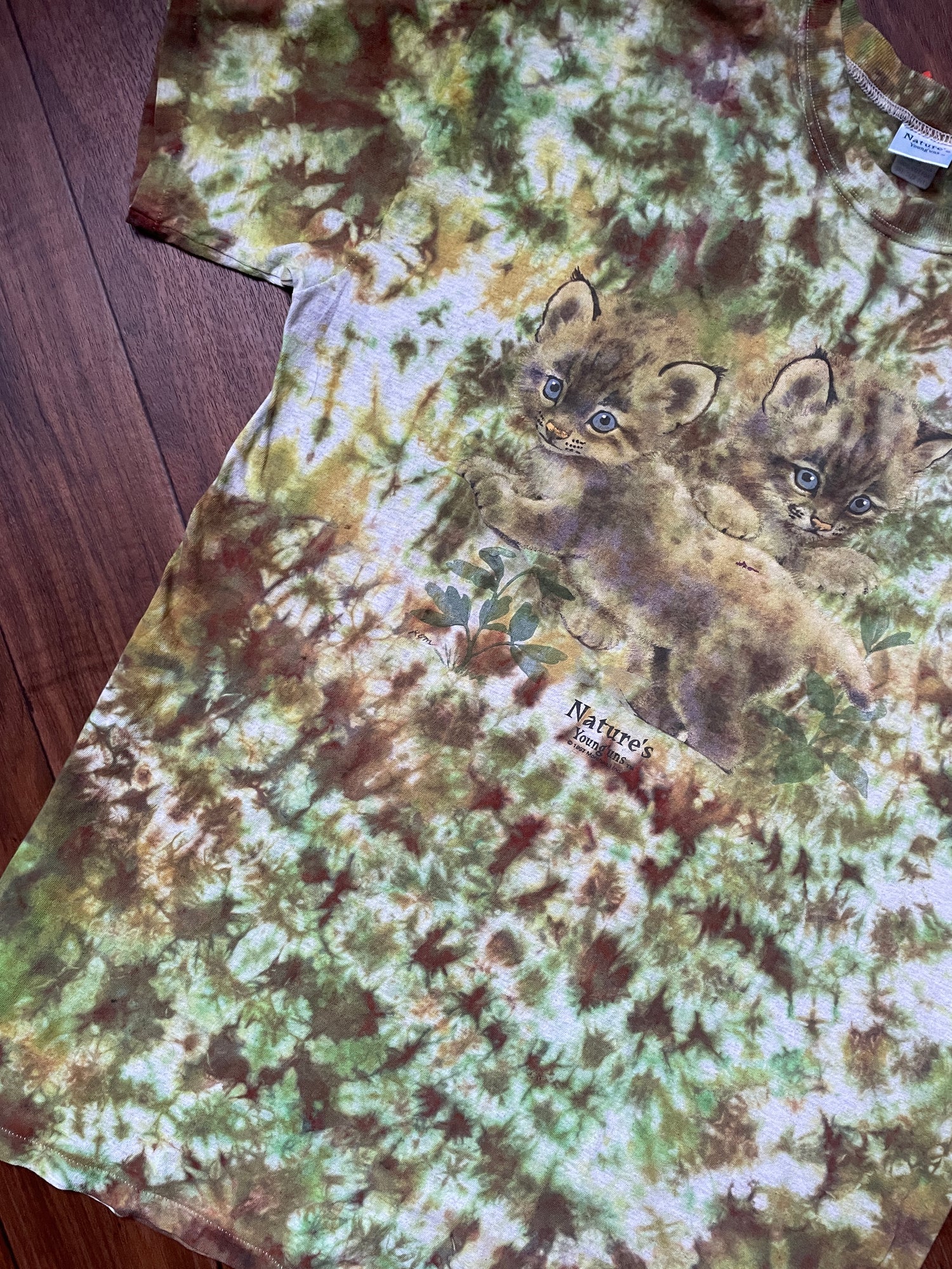 one-of-a-kind hand tie dye t-shirt with large, subtle cats graphic on front