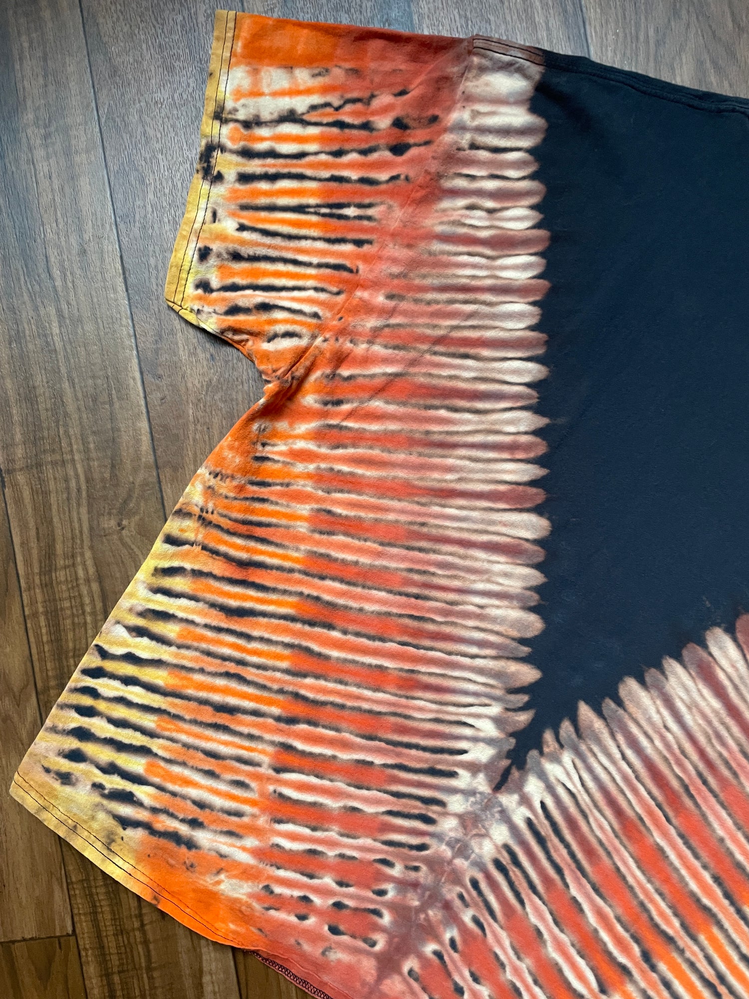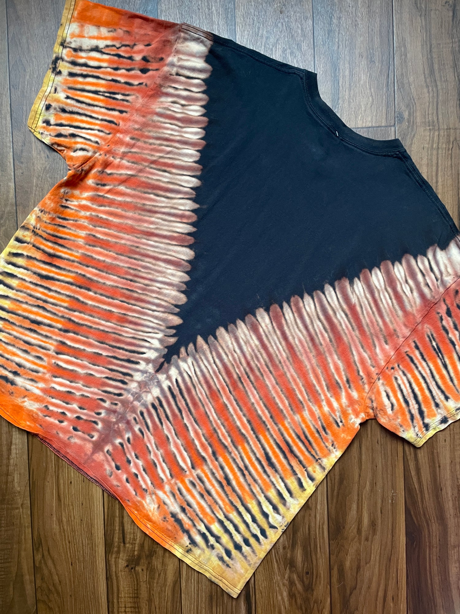 black t-shirt bleached and dyed with v-pleat tie dye pattern