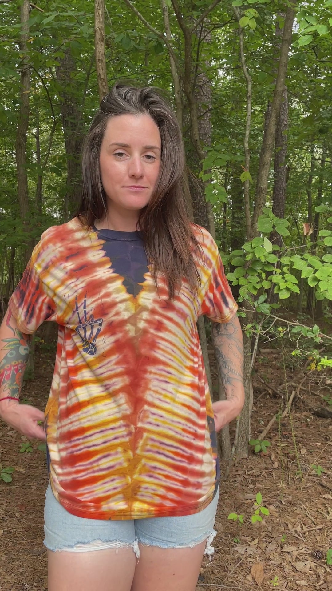 navy blue t-shirt bleached and dyed with shades of orange and yellow pleated tie dye pattern