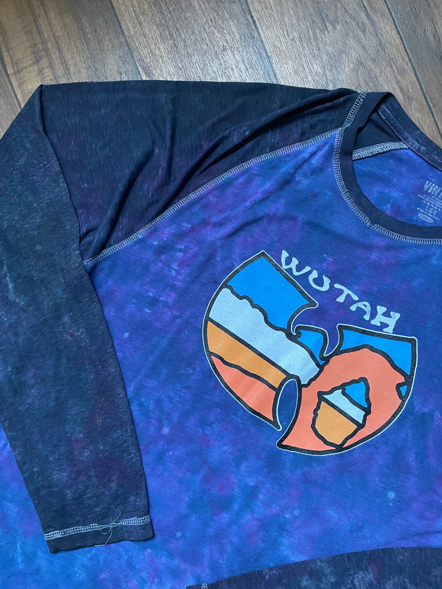 with large hand-printed WUTAH Delicate Arch graphic on front
