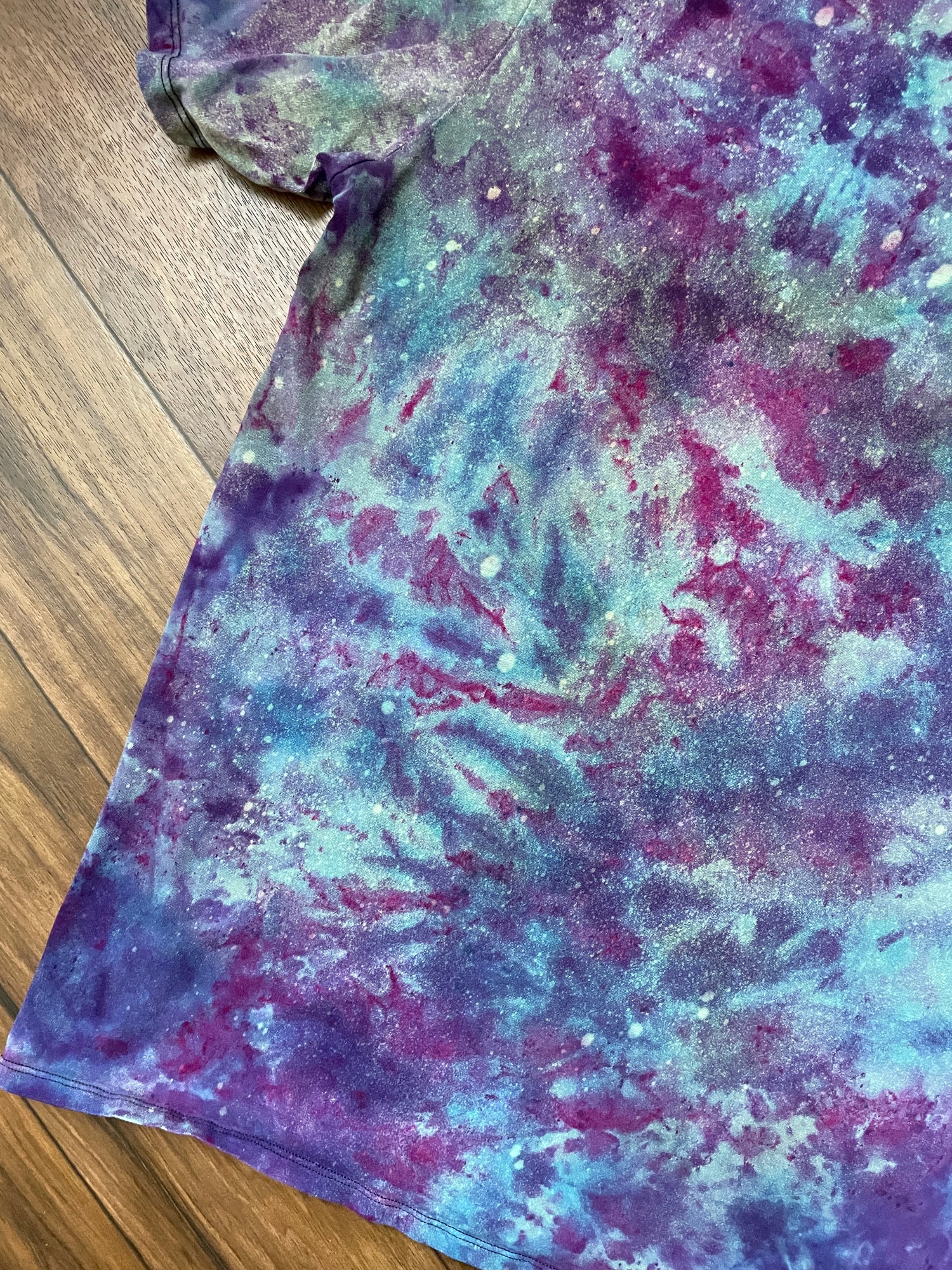 white tshirt dyed with shades of blue and pink galaxy tie dye pattern