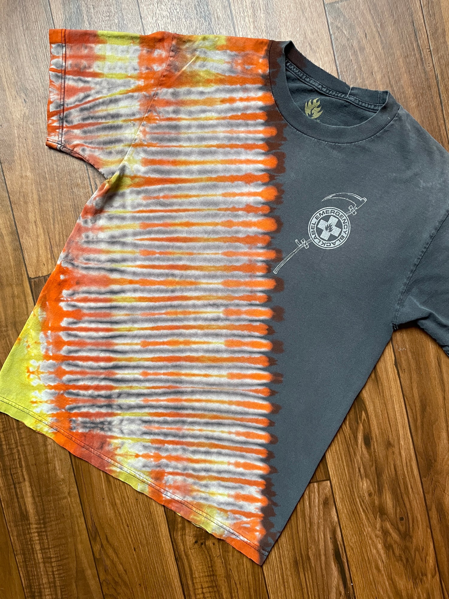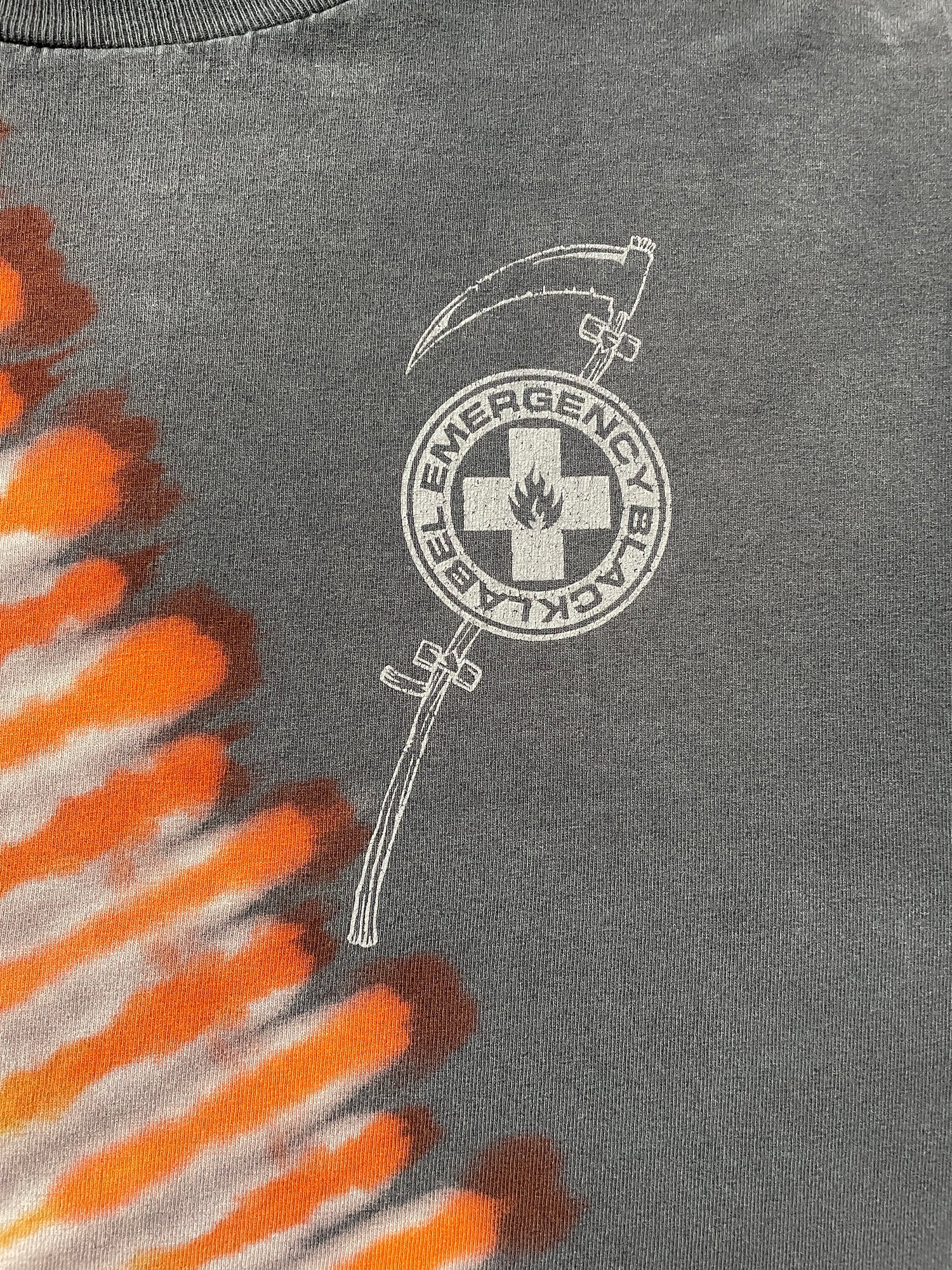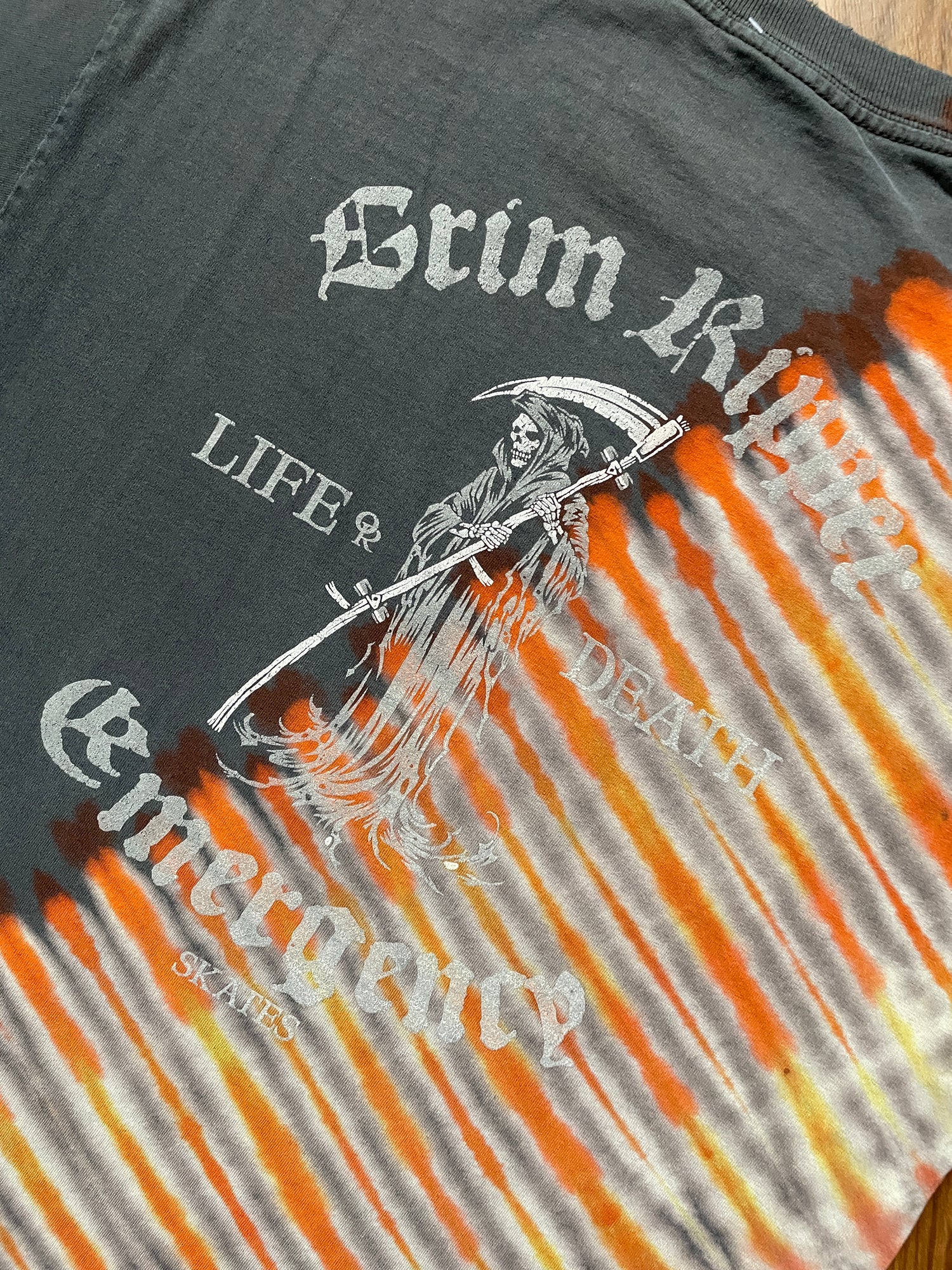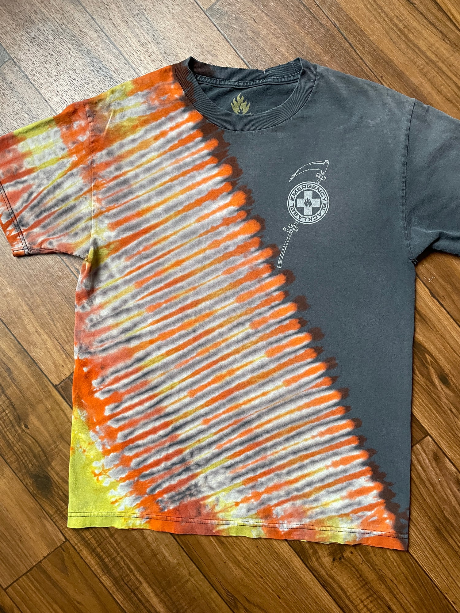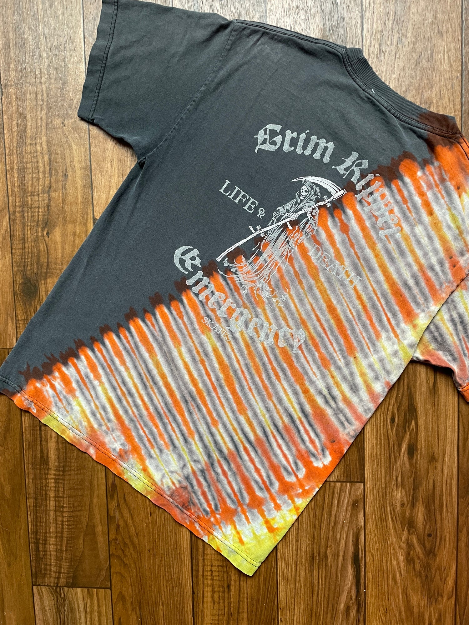 one-of-a-kind hand tie dye t-shirt with small Emergency Black Label graphic on front and large grim reaper graphic on back