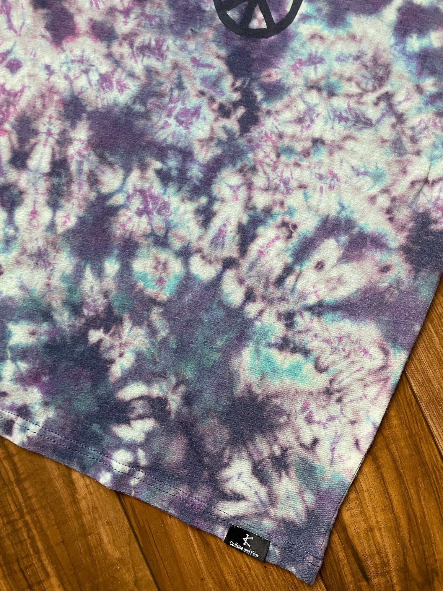 one-of-a-kind hand tie dye t-shirt with handprinted peace sign graphic on front