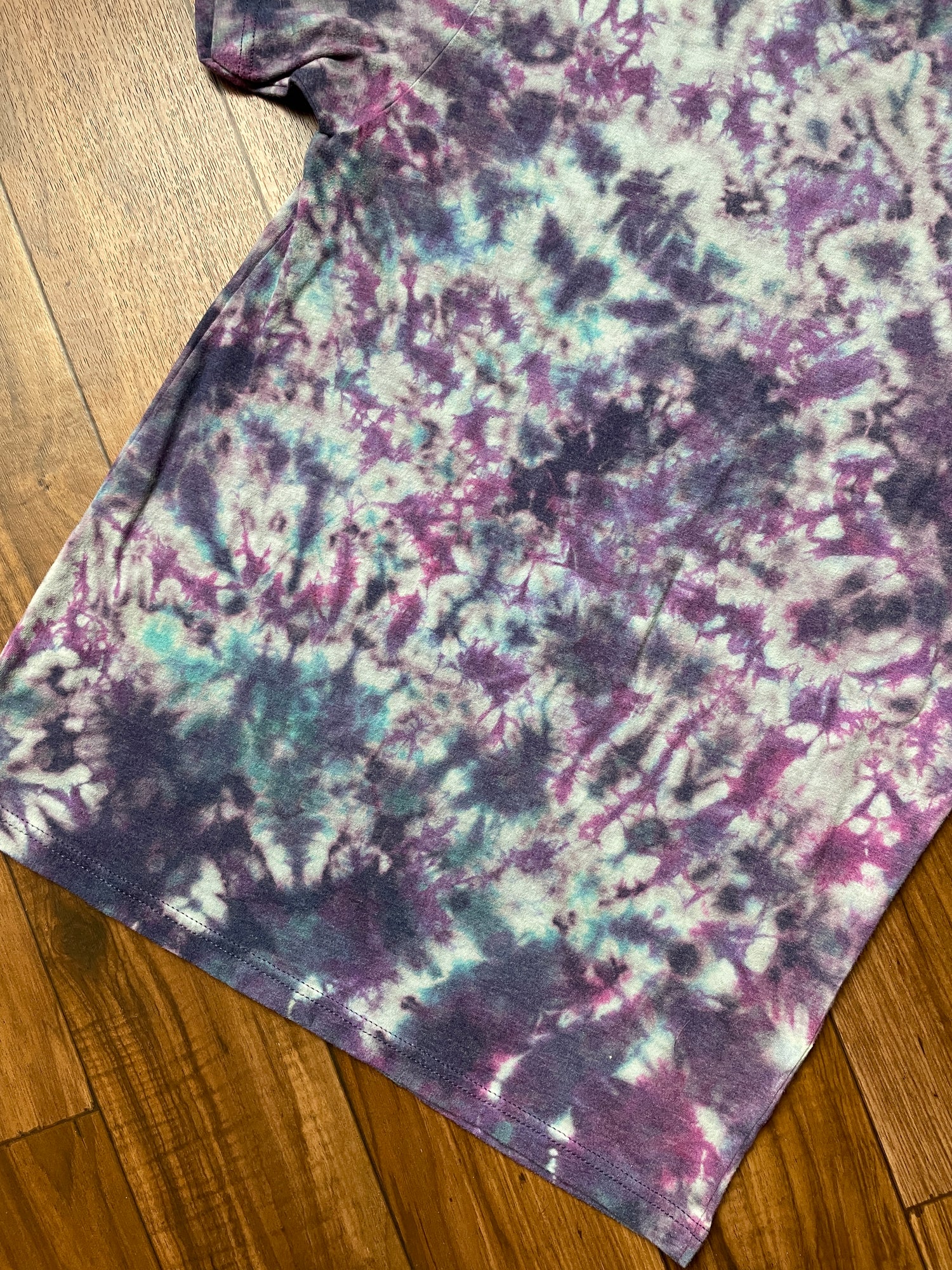 blue t-shirt bleached and dyed with crumpled tie dye pattern