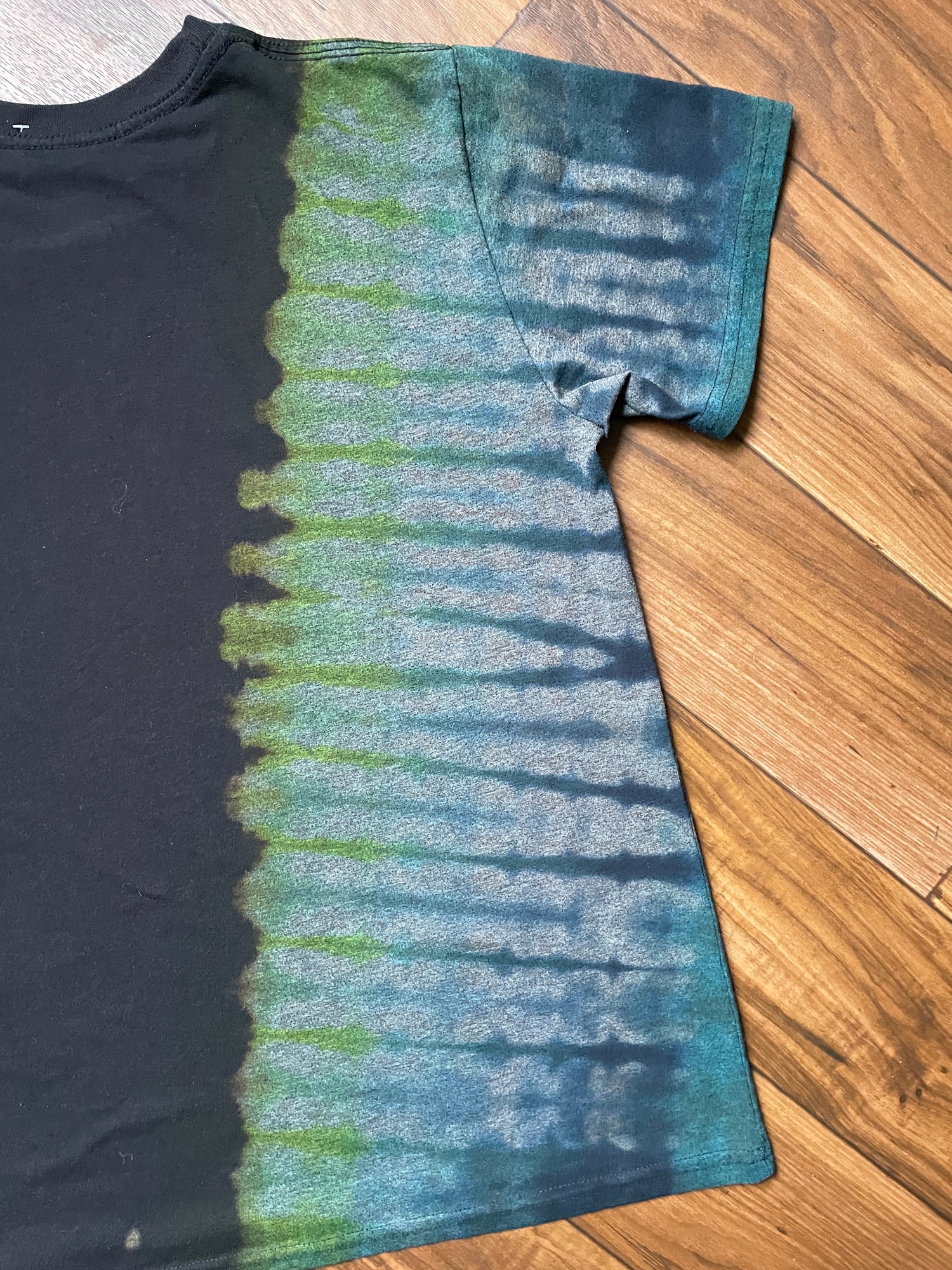 black tshirt bleahed and dyed with pleated tie dye pattern