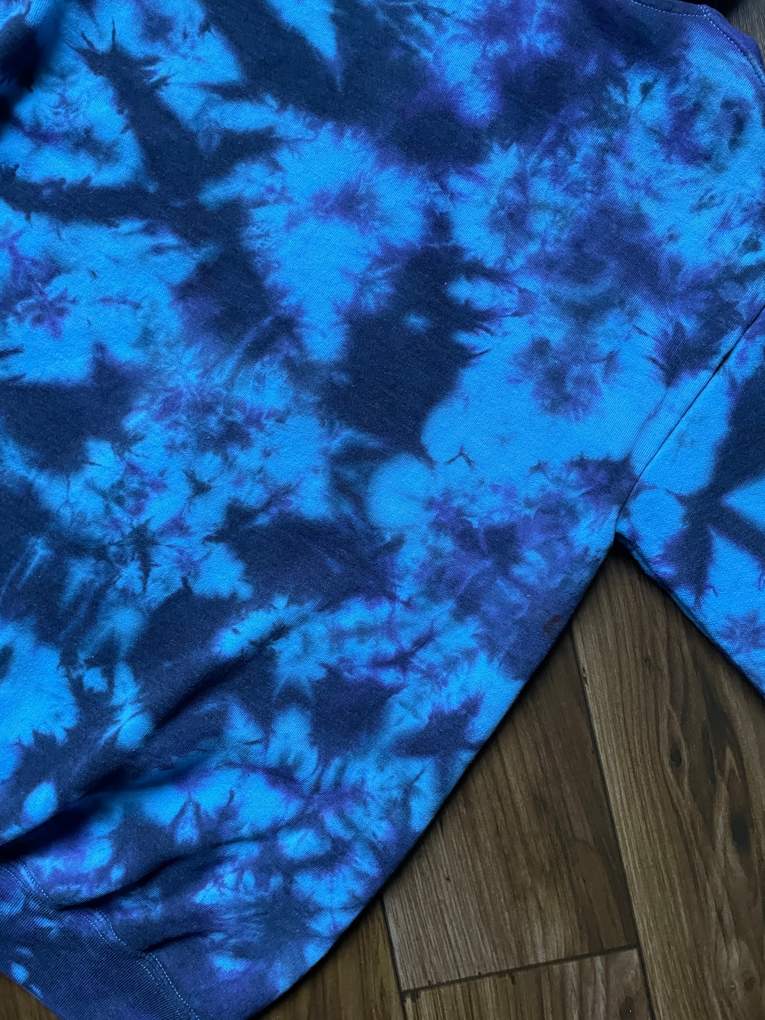 light blue sweatshirt dyed with crumpled tie dye pattern