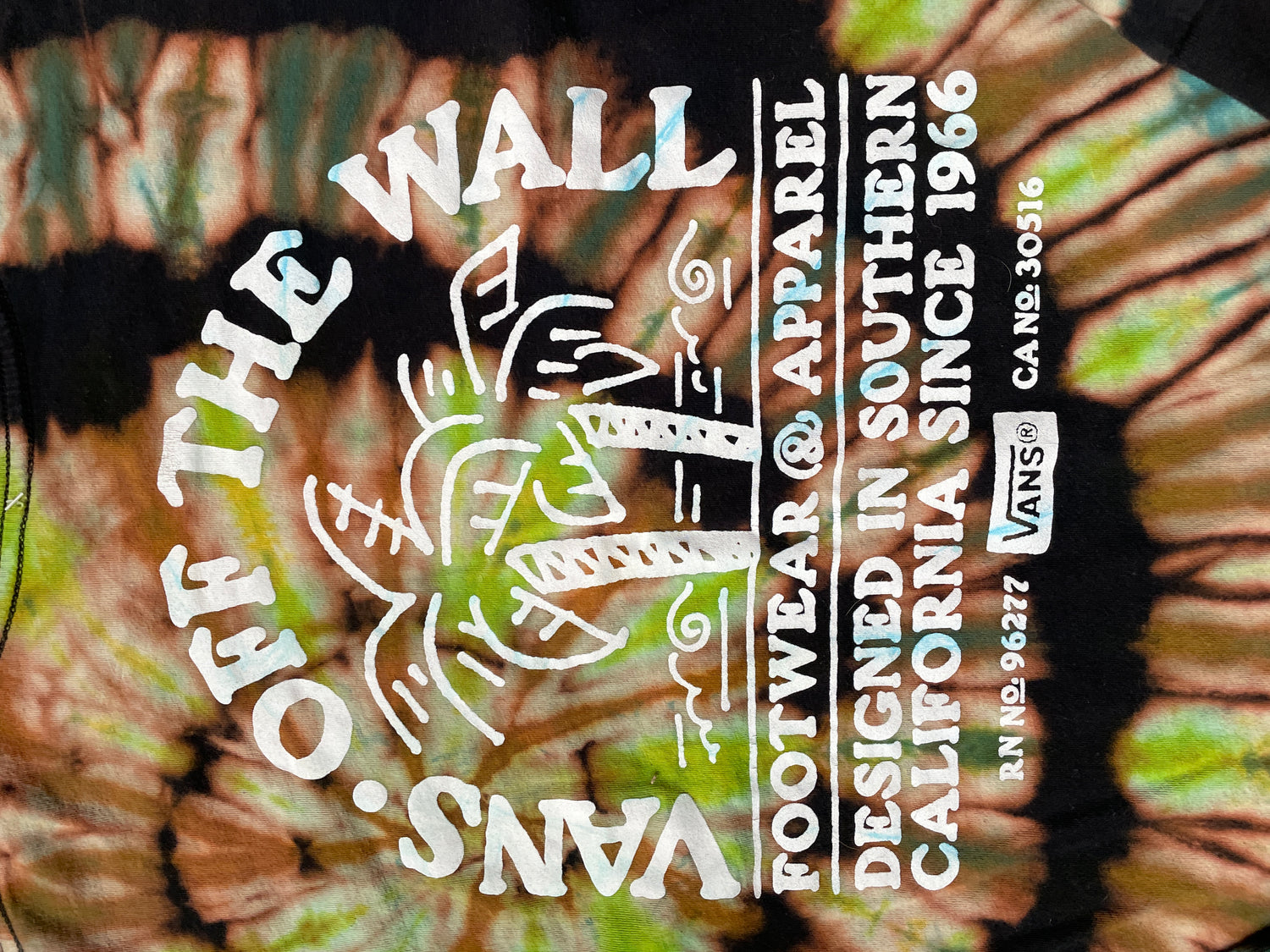 one-of-a-kind hand tie dye t-shirt with small Vans graphic on front and large Off the Wall graphic on back