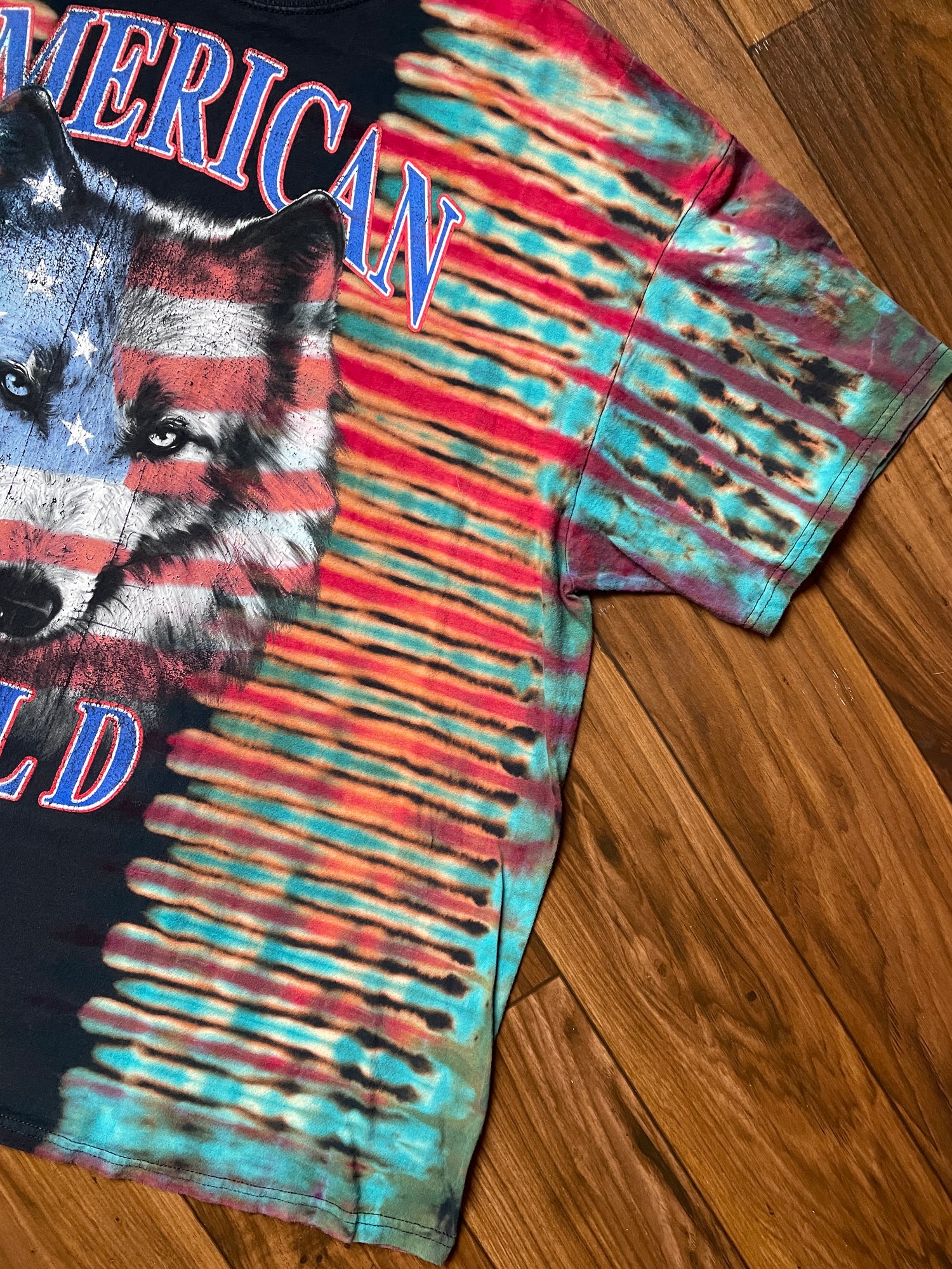 one-of-a-kind hand tie dye t-shirt with American Wild wolf graphic on front