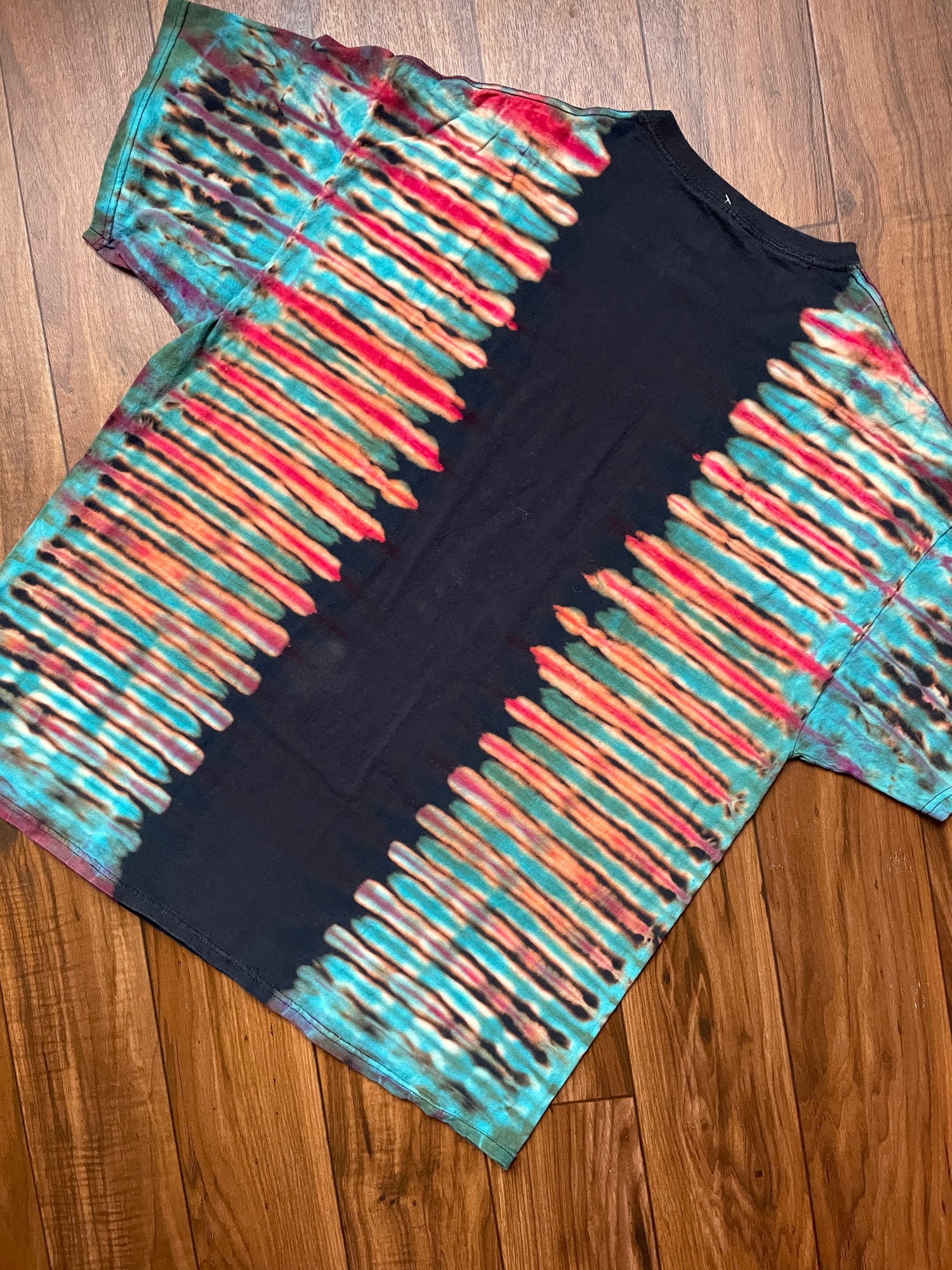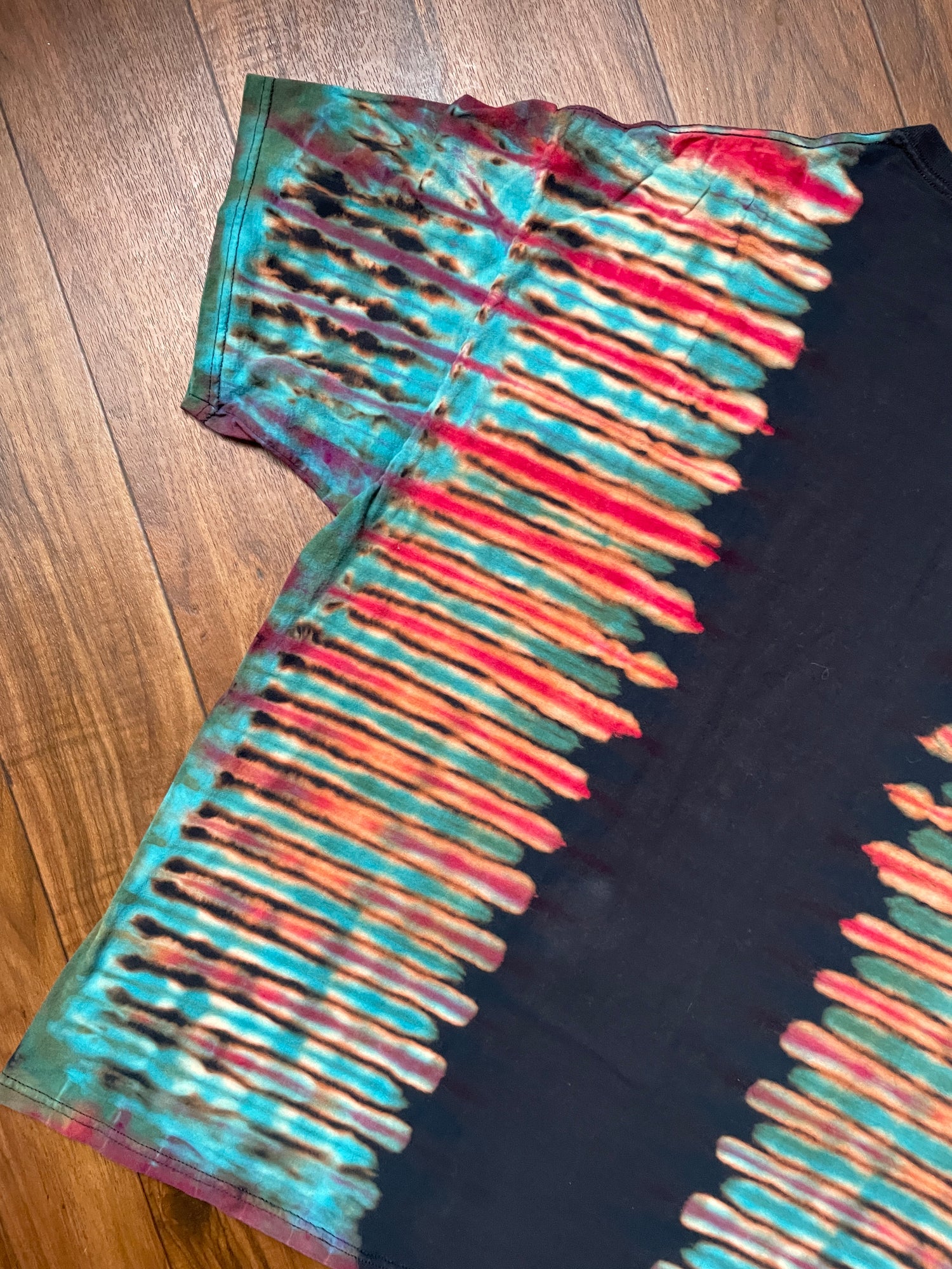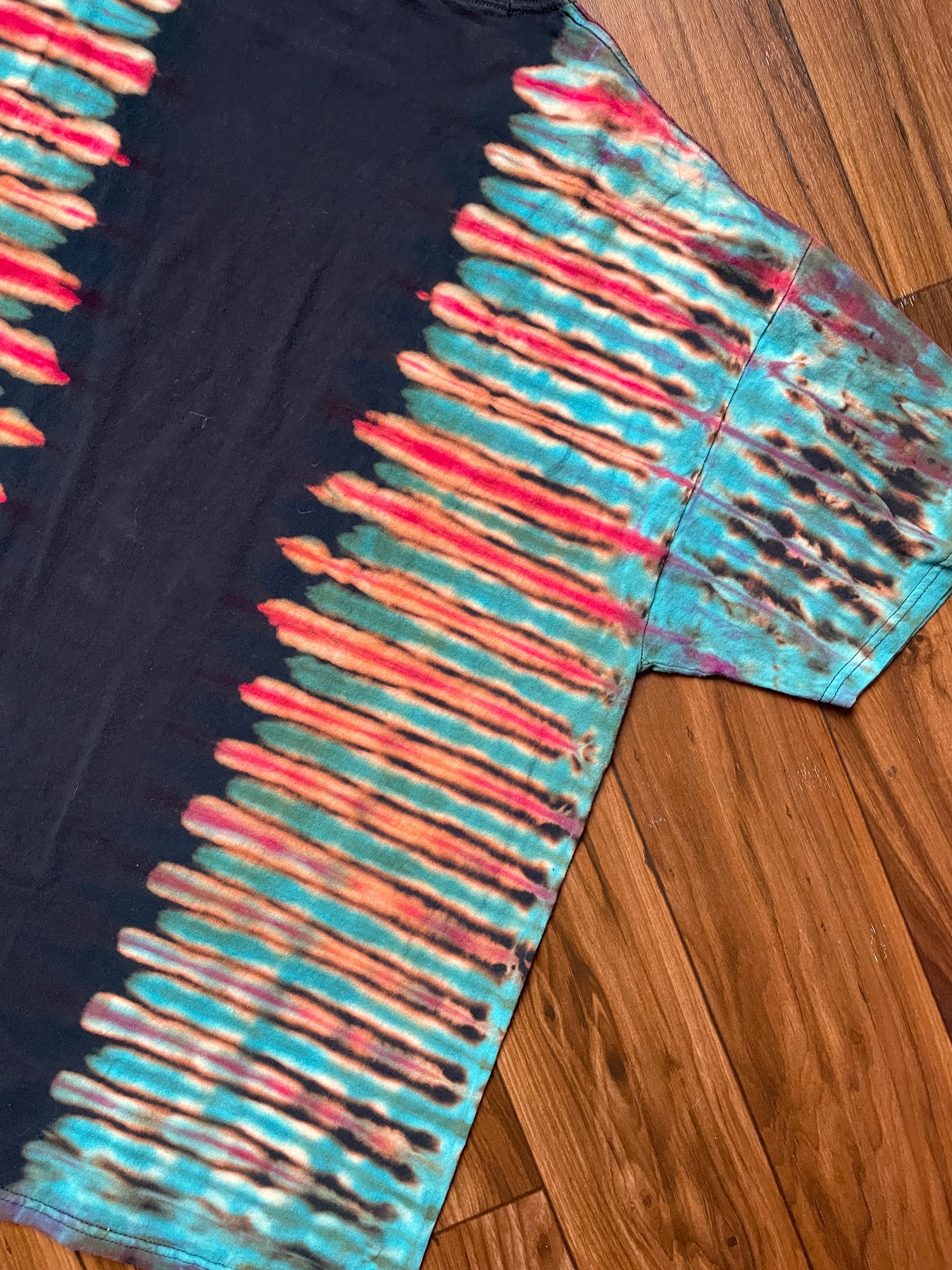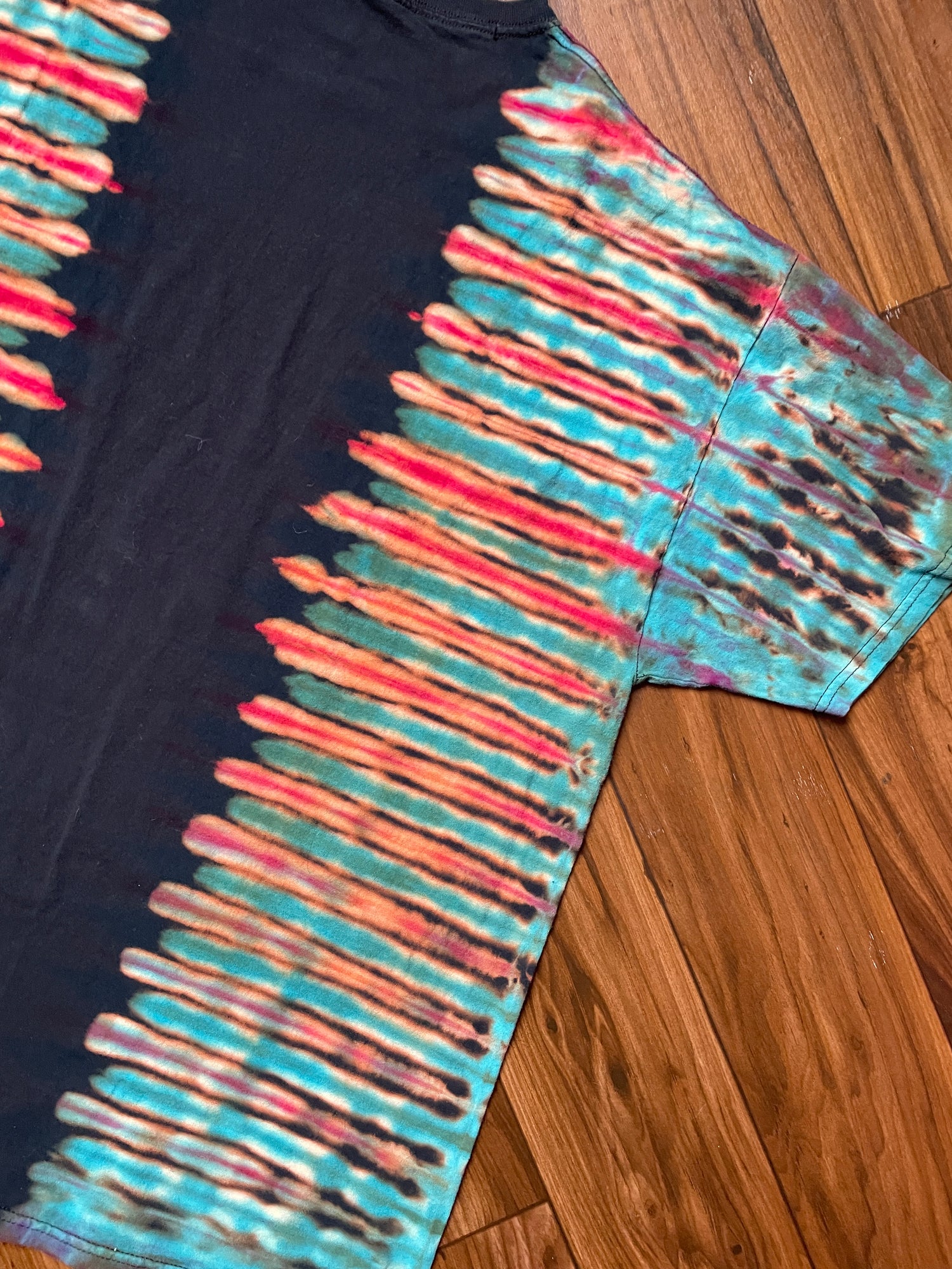 black t-shirt bleached and dyed with pleated tie dye pattern