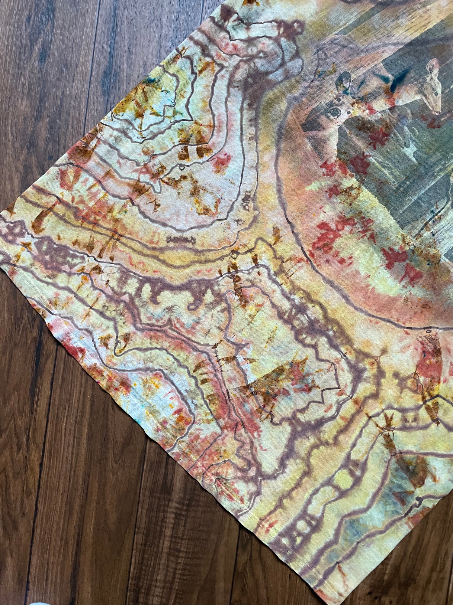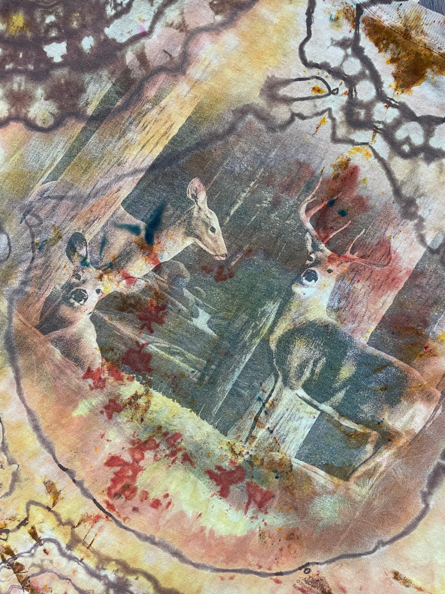 one-of-a-kind hand tie dye t-shirt with small deer graphic on front and large graphic on back