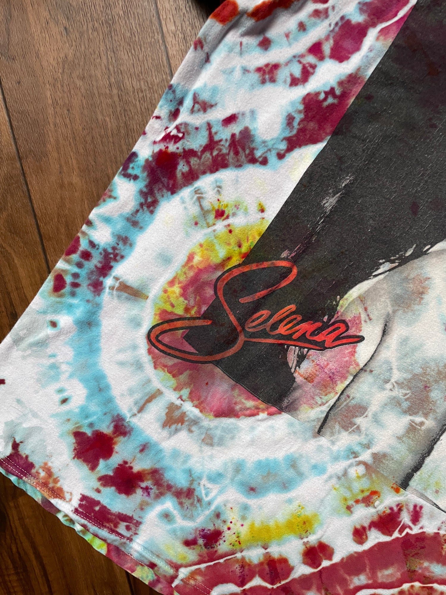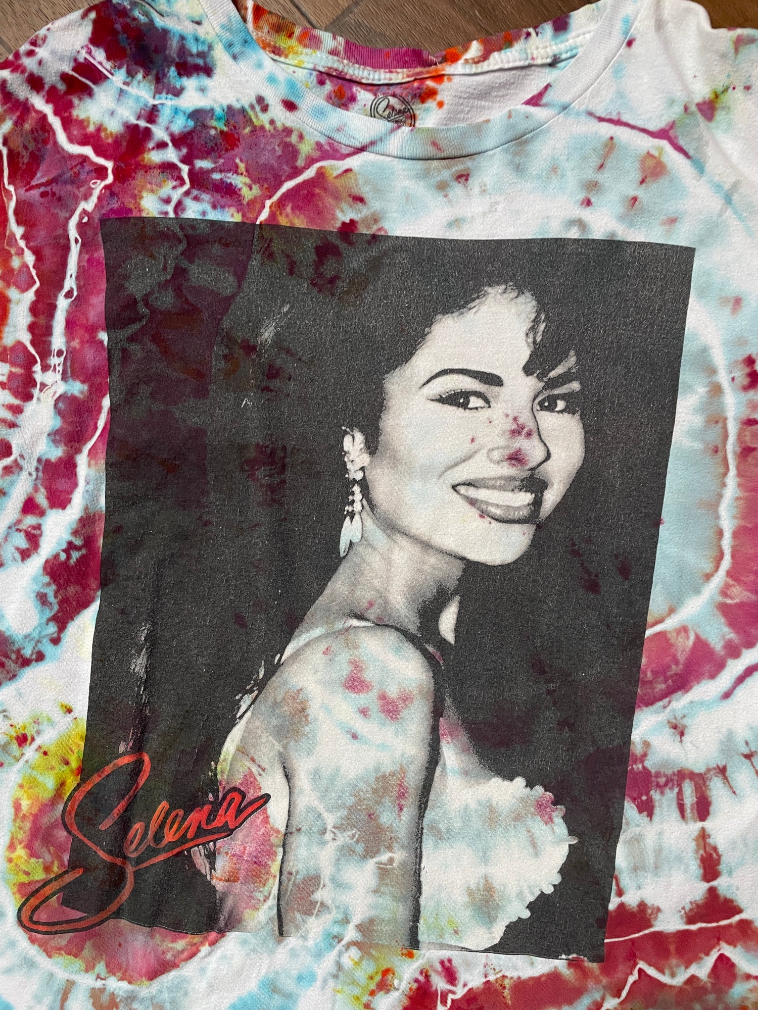 one-of-a-kind hand tie dye t-shirt with large Selena graphic on front