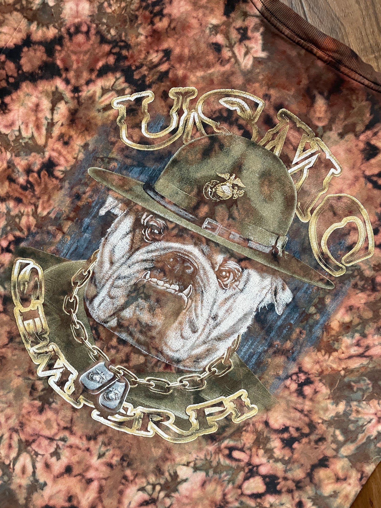 one-of-a-kind hand long sleeve tie dye t-shirt with small USMC graphic on front and large bulldog graphic on back