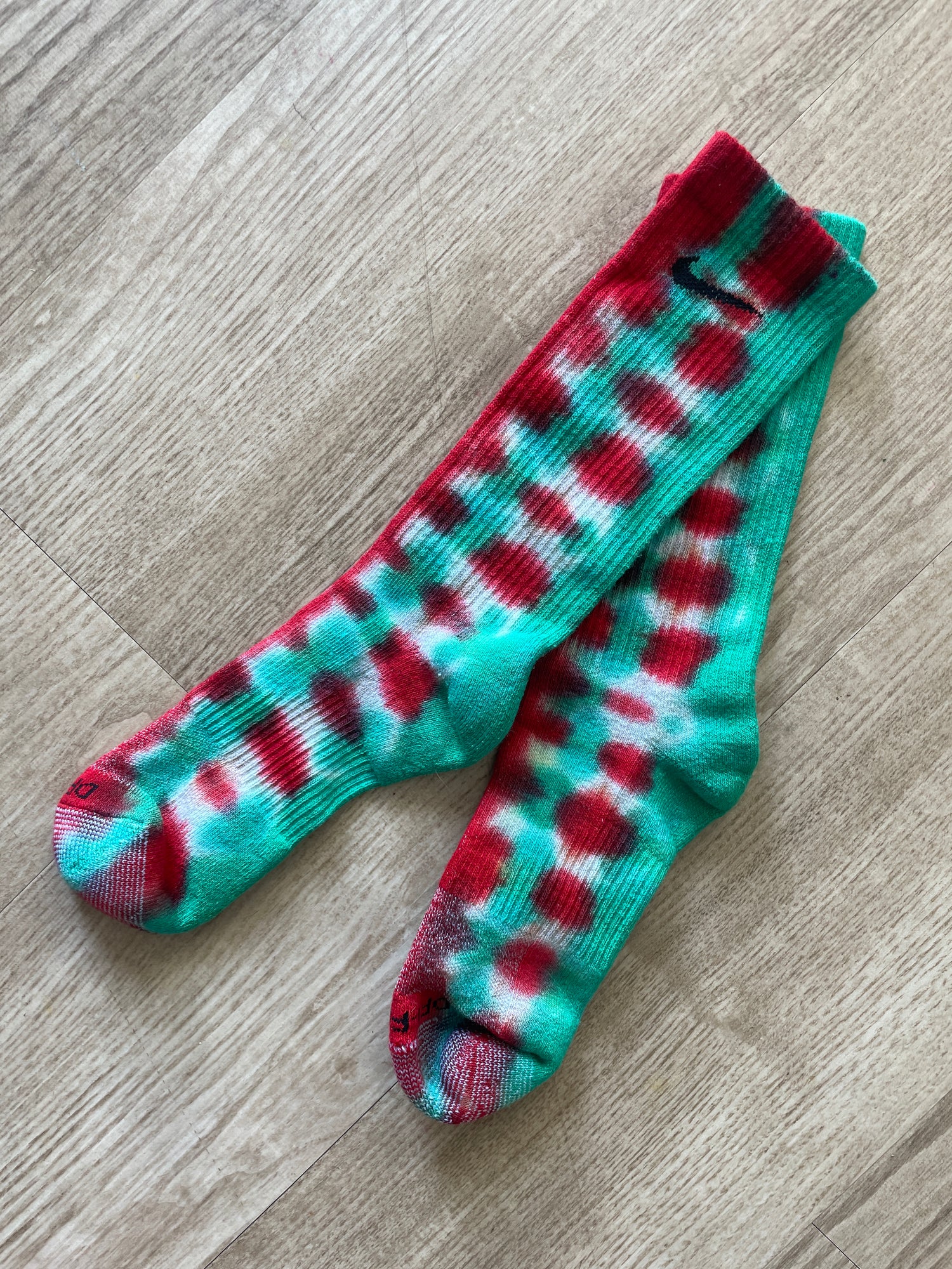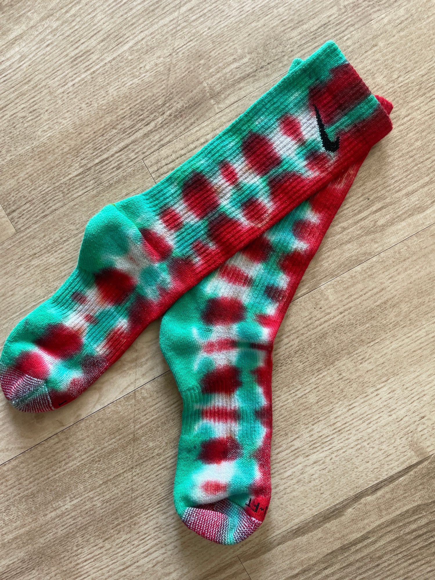 NIKE Christmas Socks Hand Tie Dyed Red and Green Nike Dri-FIT Everyday Plus Crew Training Socks - Size Large (Men's 8-12/Women's 10-13)
