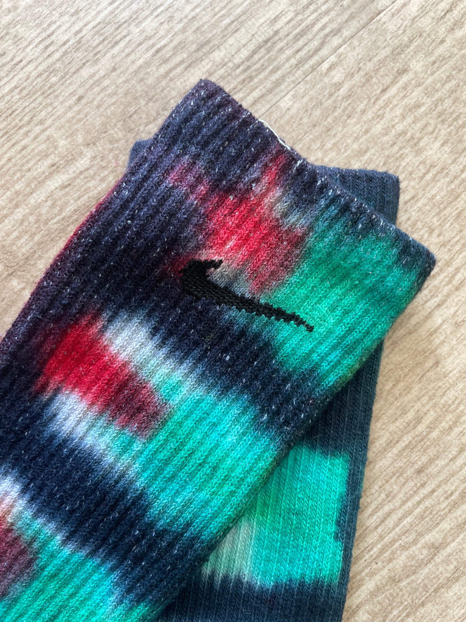 NIKE Christmas Socks Hand Tie Dyed Red, Green, and Black Nike Dri-FIT Everyday Plus Crew Training Socks - Size Large (Men's 8-12/Women's 10-13)