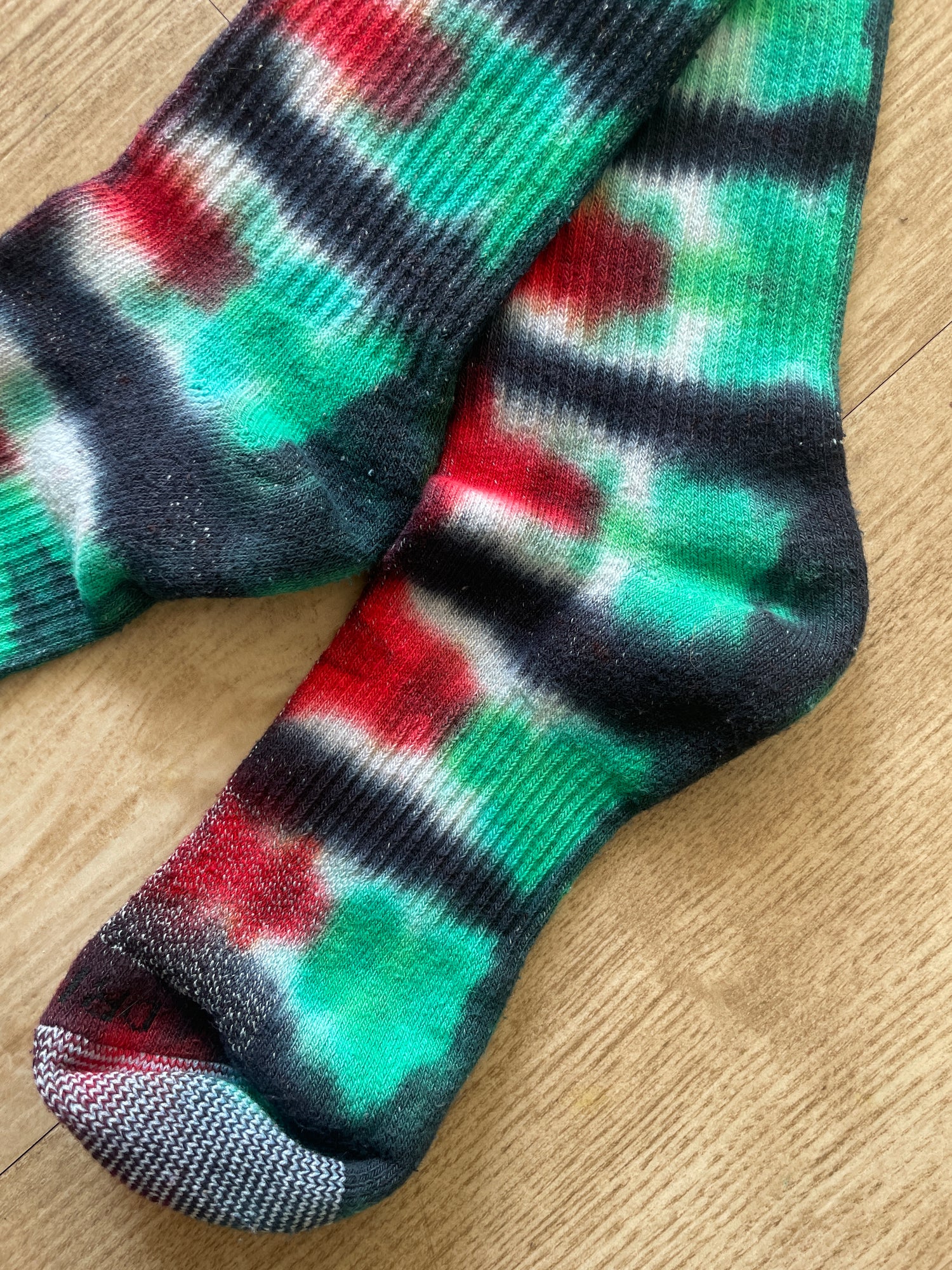 white socks with pleated tie dye pattern and red, green, and black Christmas color palette