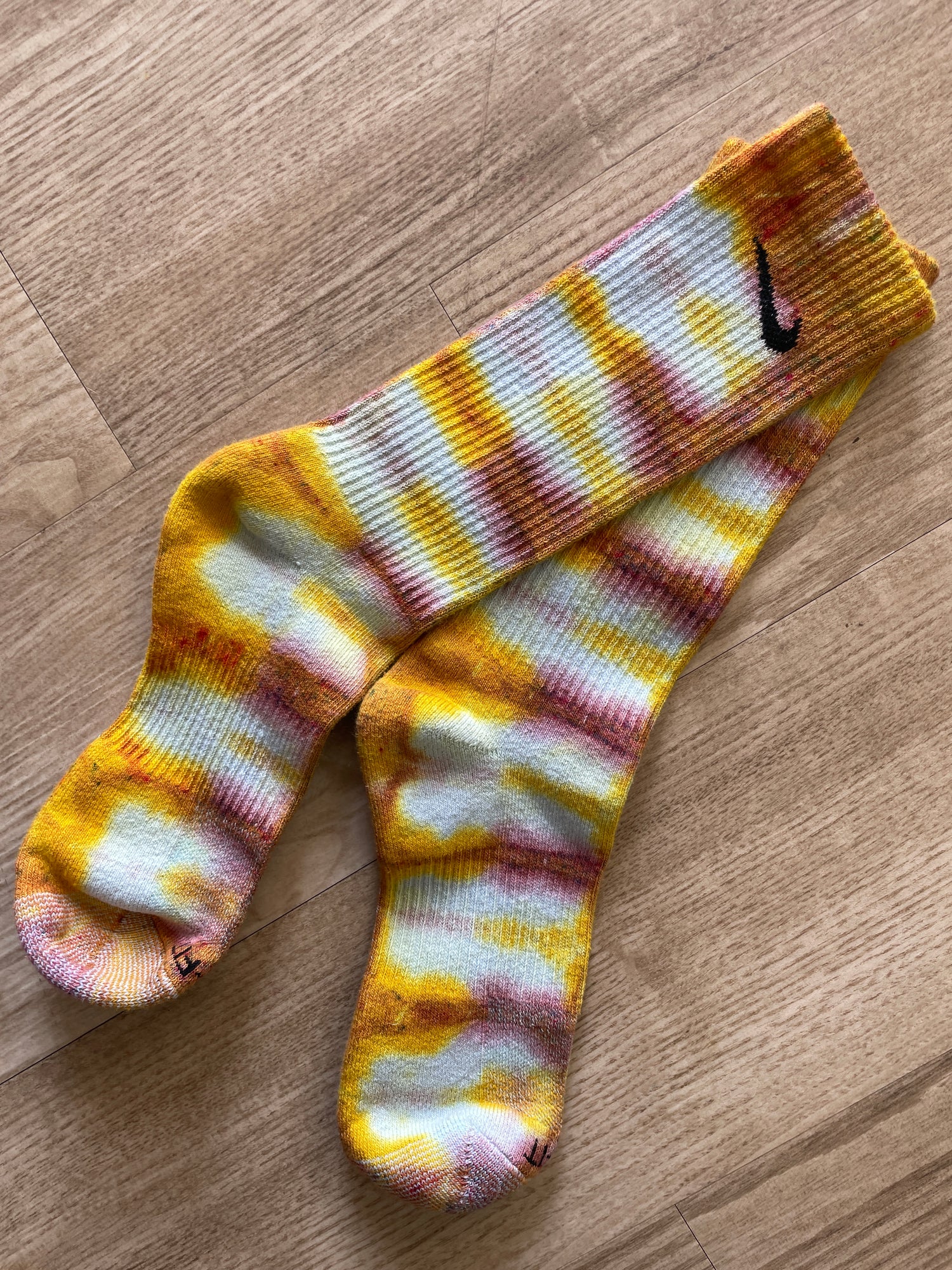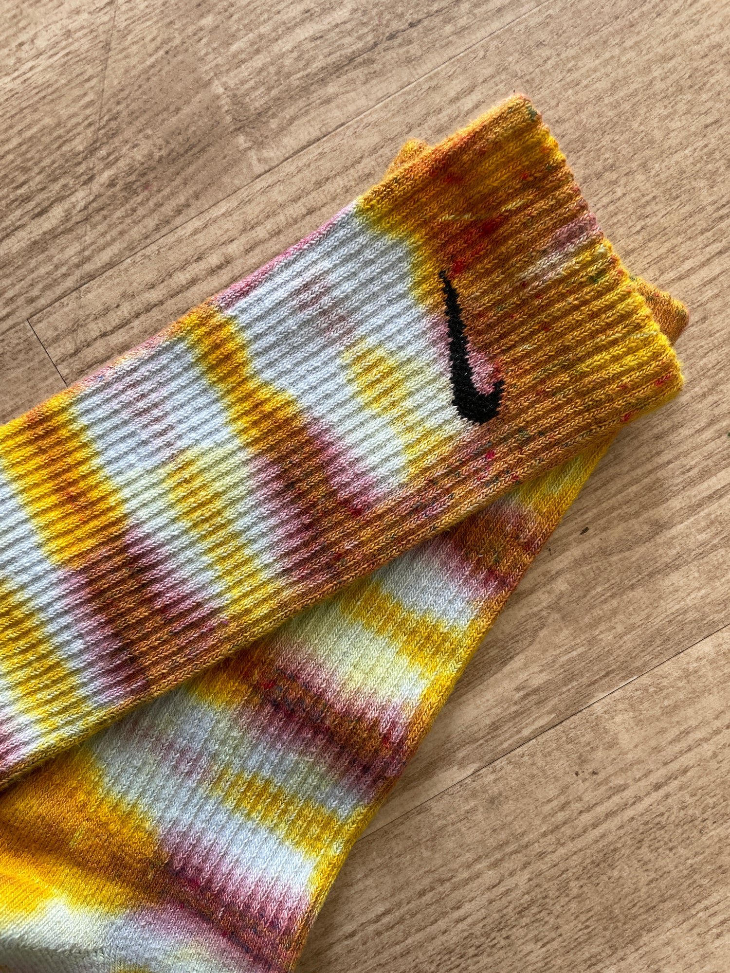 white socks with pleated tie dye pattern and yellow and pink color palette