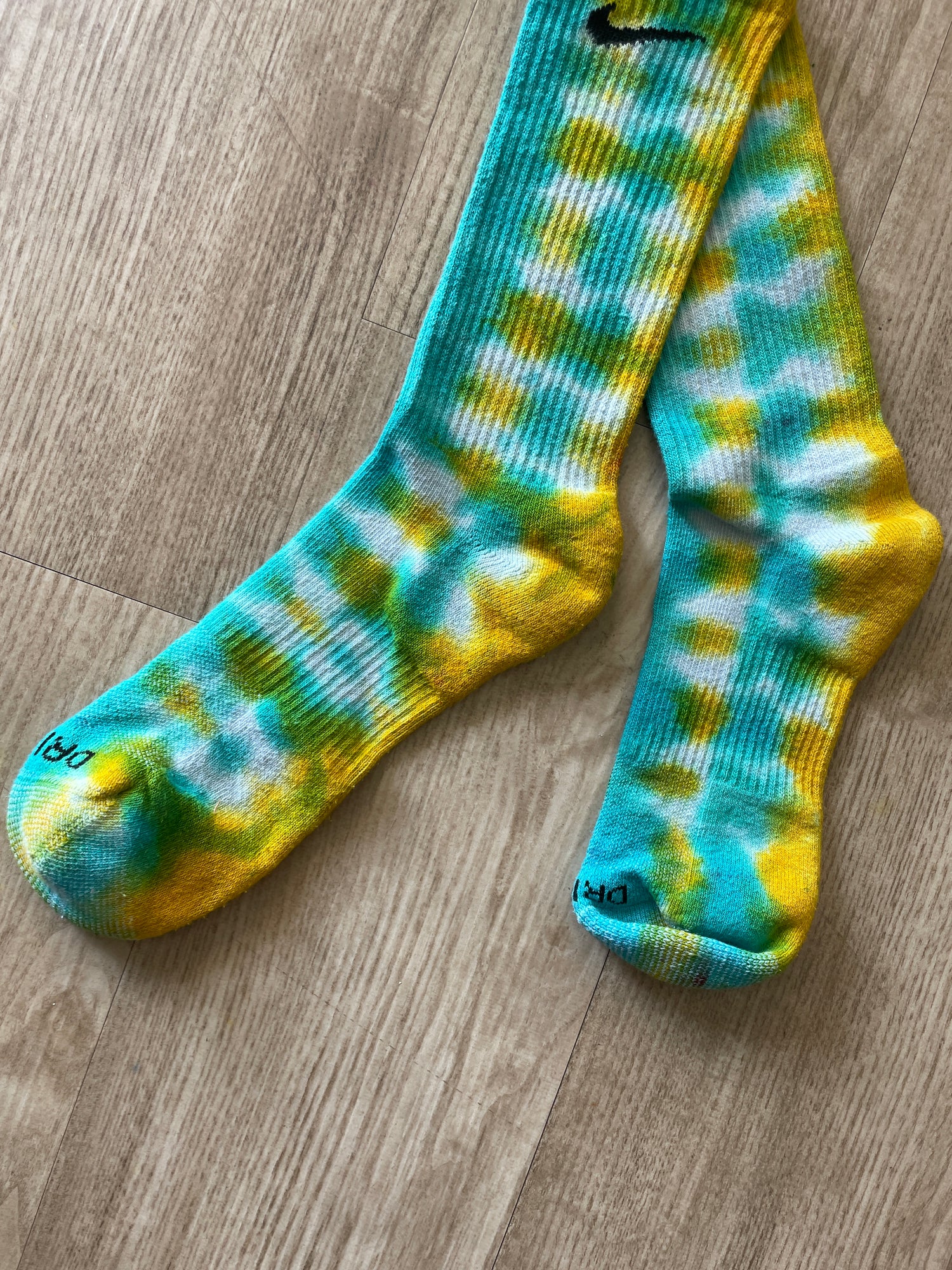 white socks with pleated tie dye pattern and yellow and teal color palette