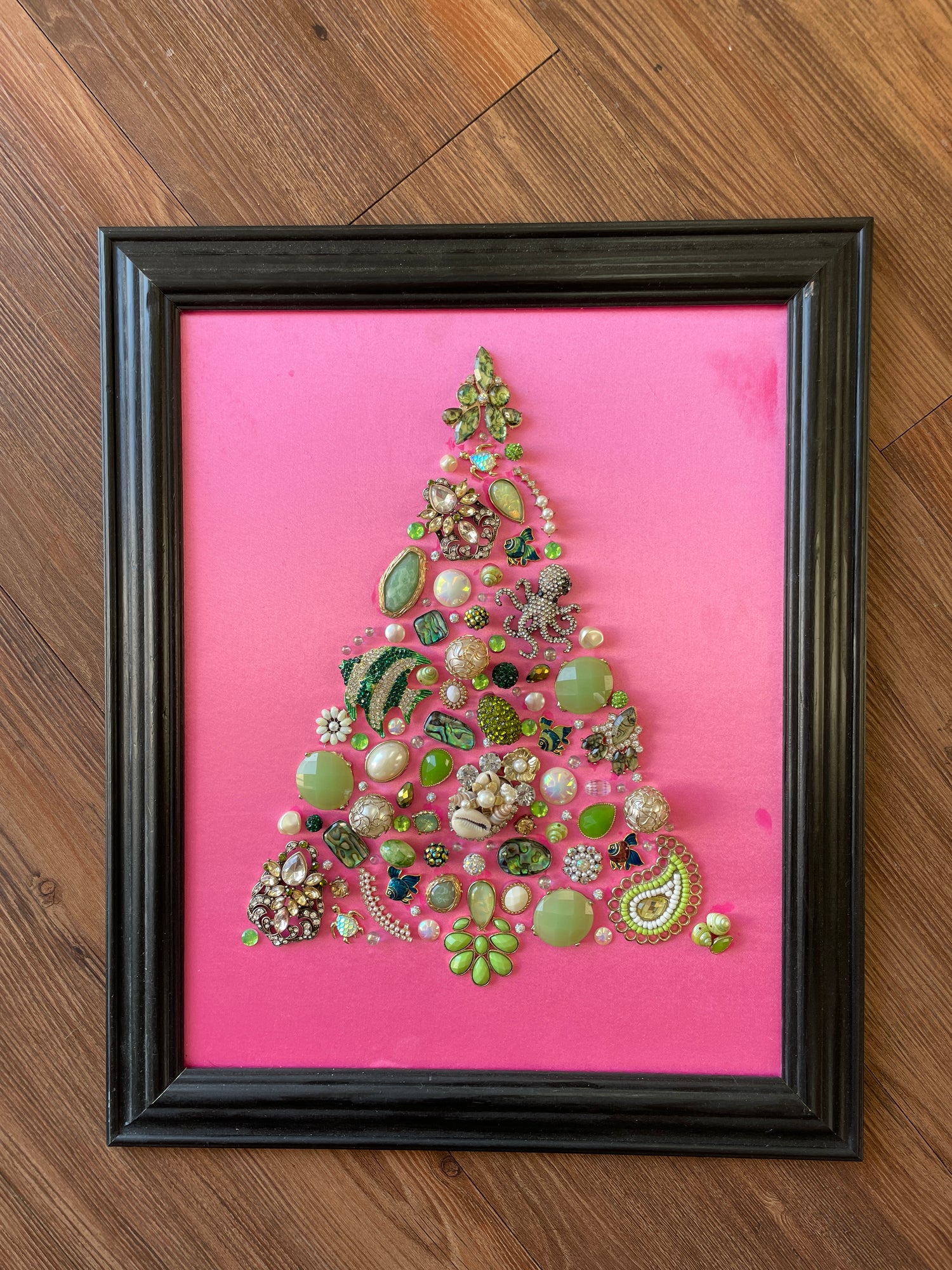Pink, Green, and Black Framed Jewelry Christmas Tree Handmade with Over 50 Pieces of Vintage & Upcycled Jewelry