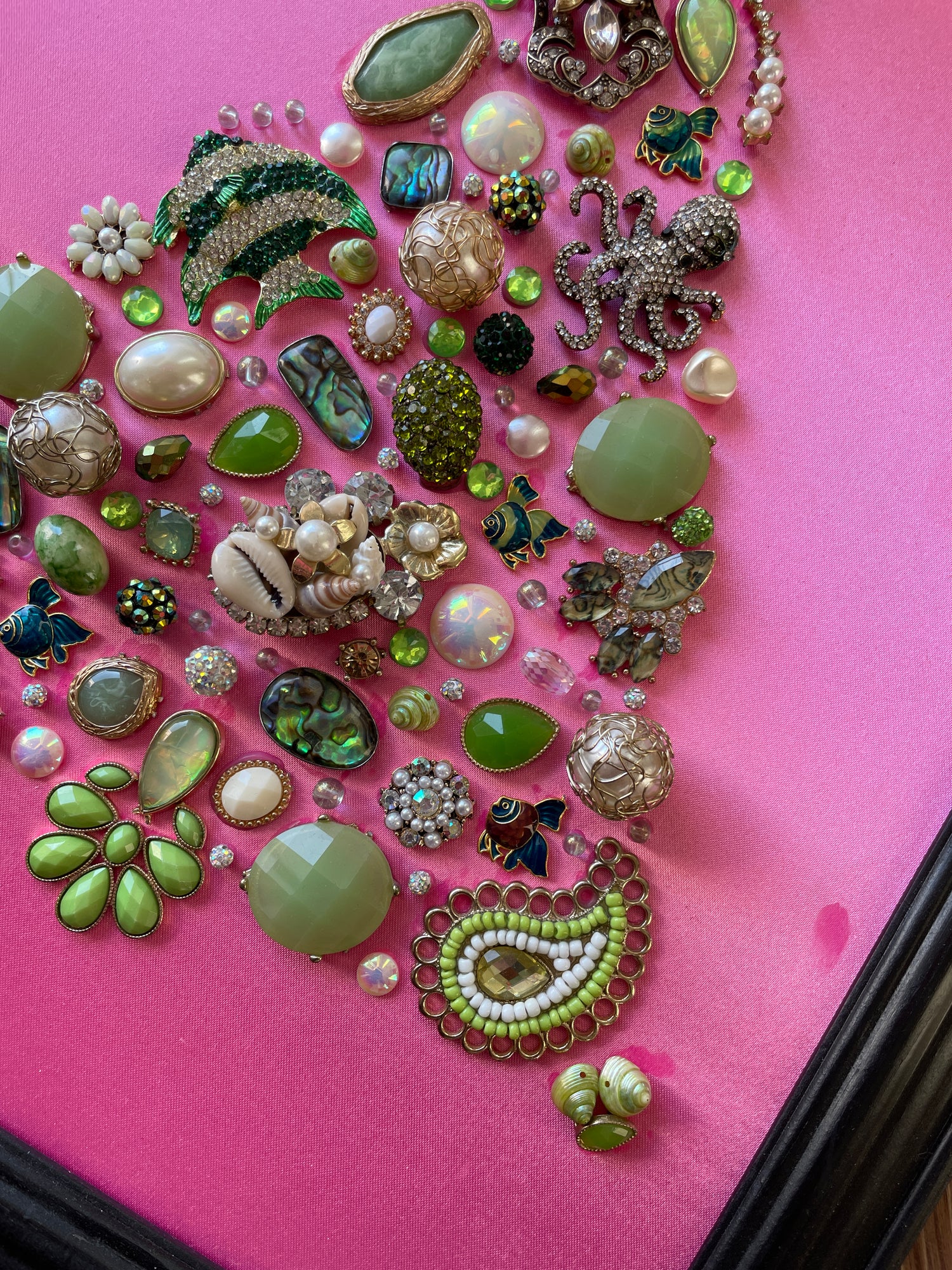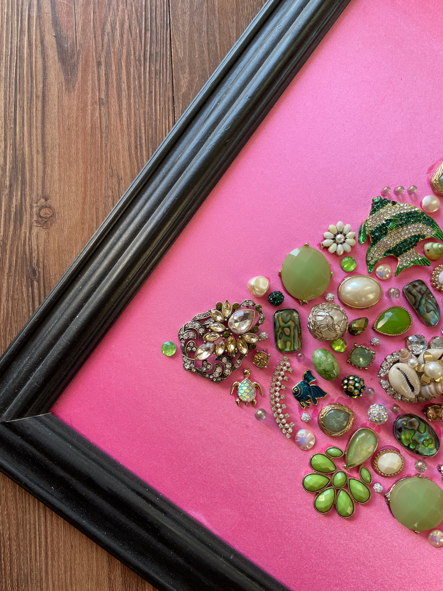 The green jewelry is matted on a pink background and framed with a beautiful black frame. The frame is approximately 13.5 in. wide x 16.5 in. long x 1 in. deep, and it is ready to hang on a wall or be displayed on an easel.