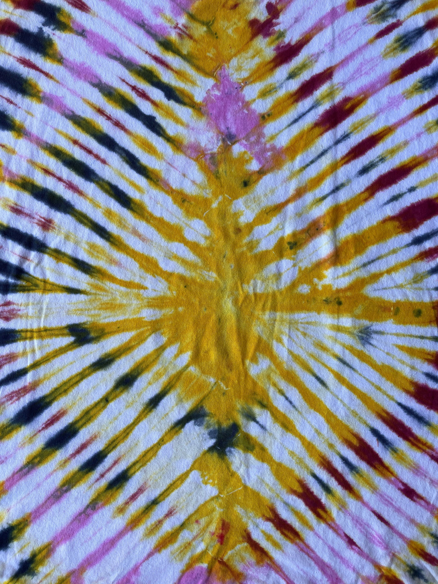 white t-shirt dyed with shades of pink, yellow, and black pleated tie dye pattern