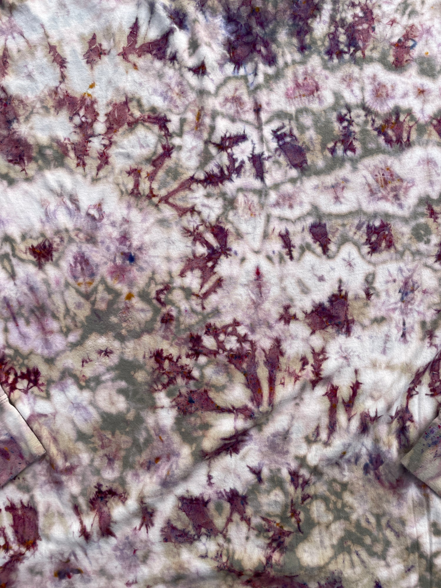 tan t-shirt that's had portions of color removed and re-dyed with light pink and purple tie dye pattern