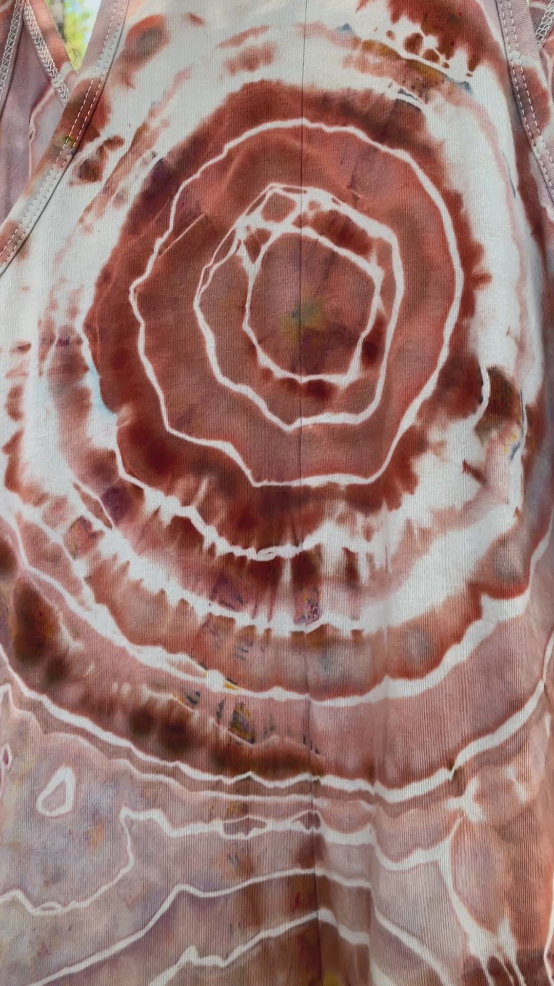 off-white jumpsuit dyed tie dyed with shades of dark orange geode pattern (this one reminds me of sandstone found in southern Utah!)
