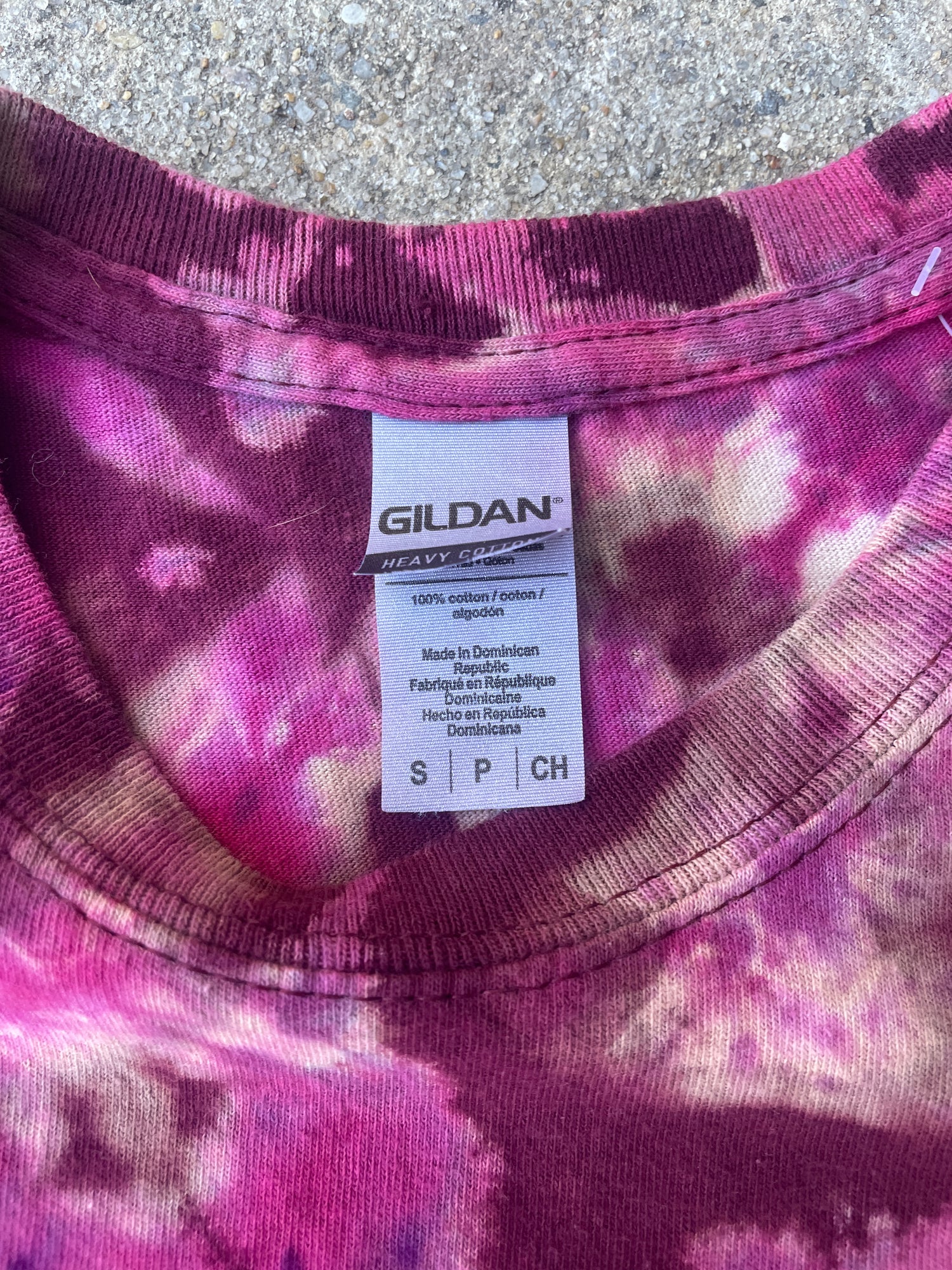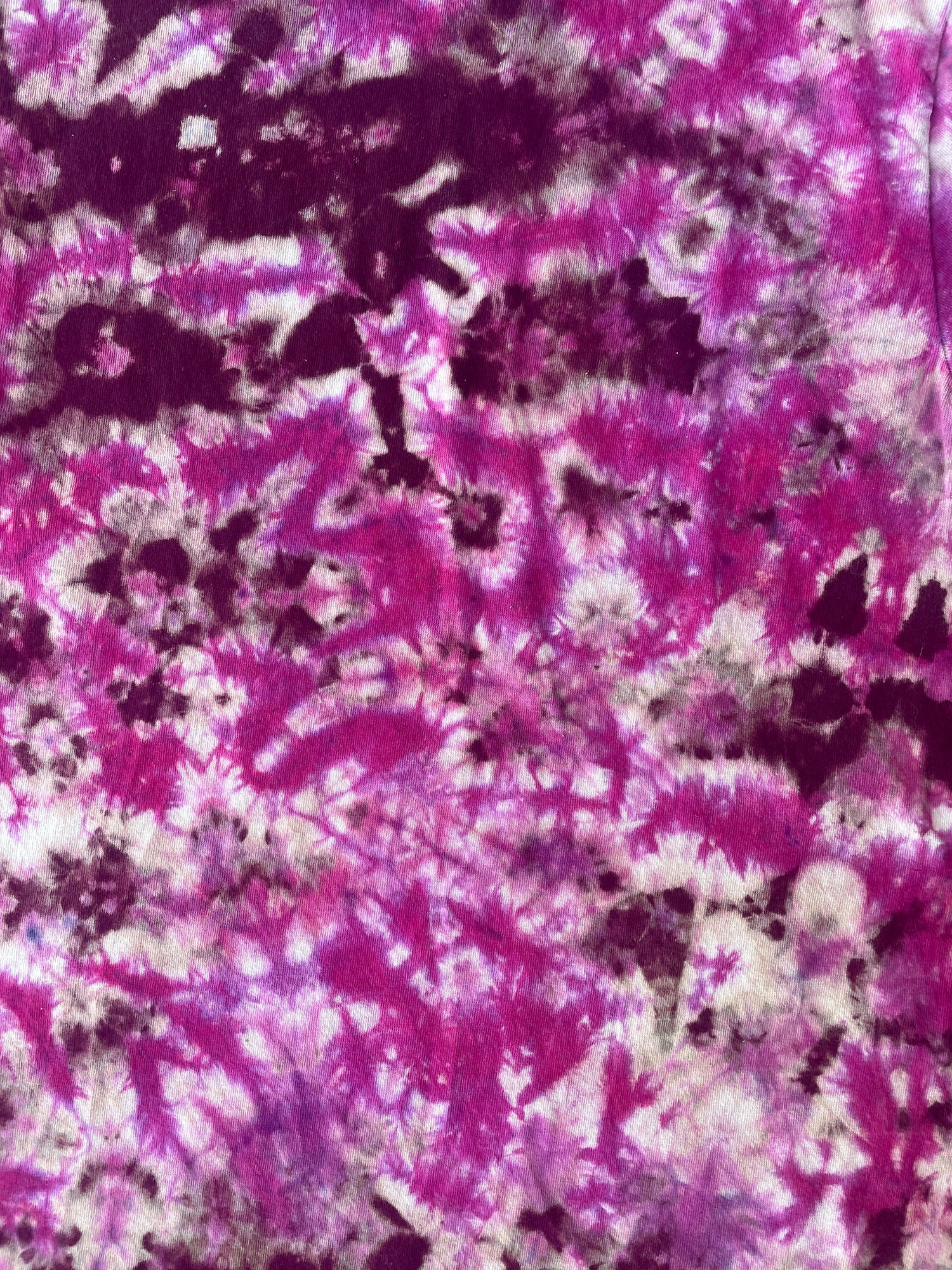 maroon t-shirt that's had portions of color removed and re-dyed with shades of pink crumpled tie dye pattern