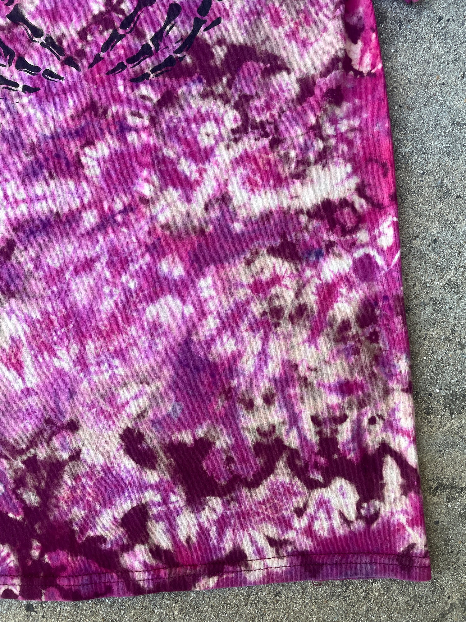 Hand-Printed Skeleton Heart Hands Pink and White Reverse Tie Dye Short Sleeve T-Shirt | Men's Size Small