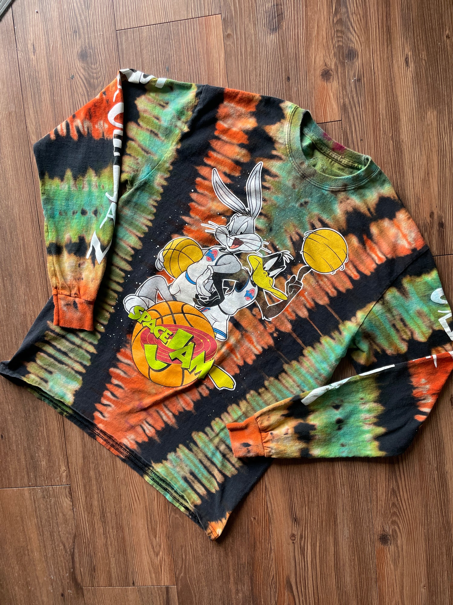Small/Medium Men’s Space Jam Reverse Tie Dye Long Sleeve T-Shirt | Black, Orange, and Blue Pleated Long Sleeve