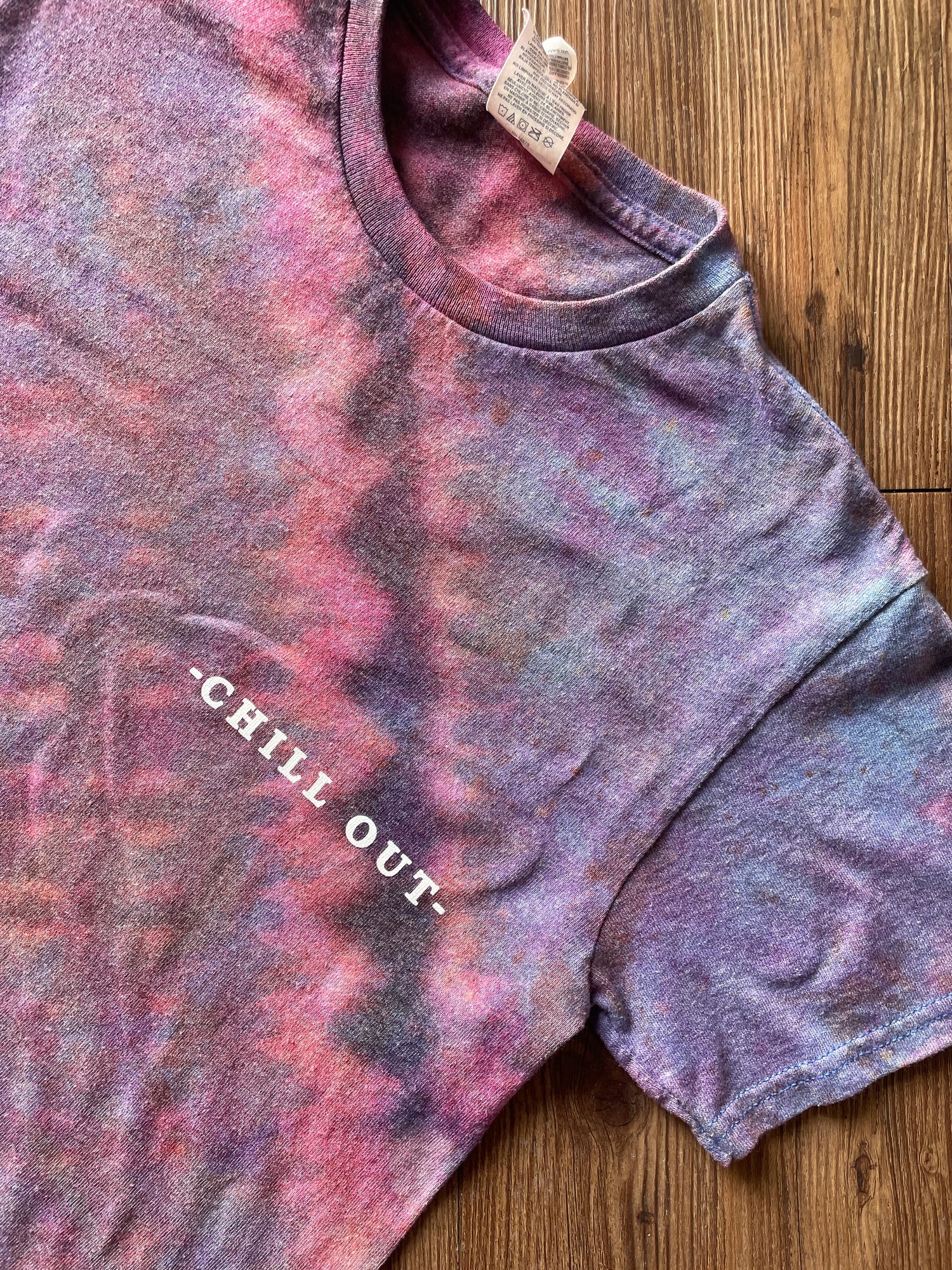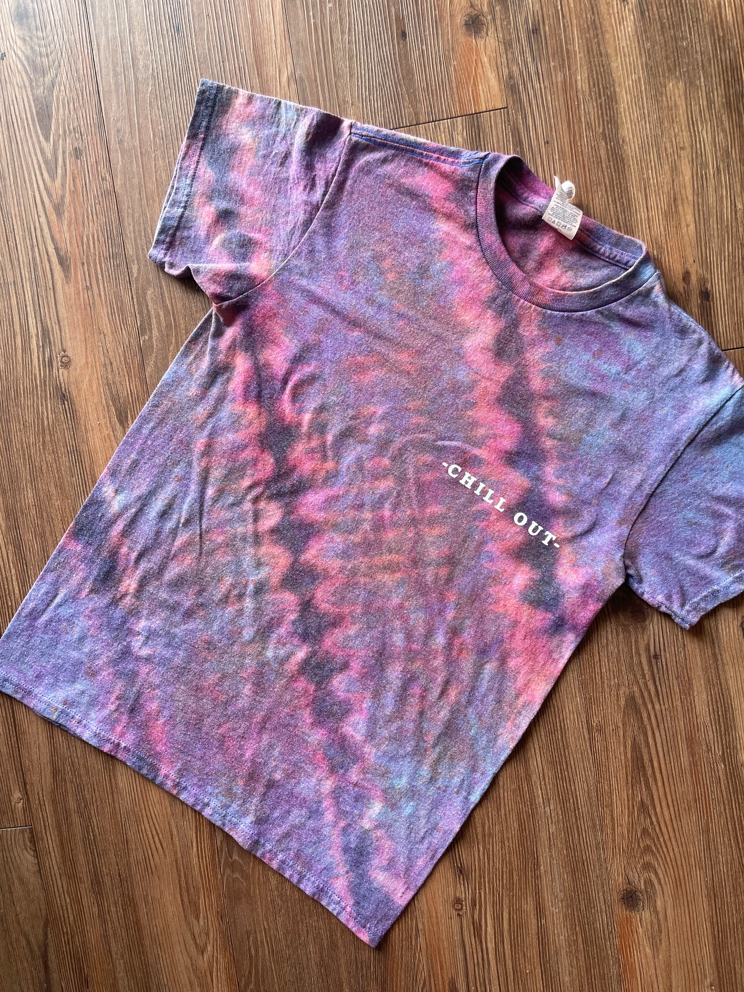 Small Men’s Chill Out Handmade Tie Dye T-Shirt | Blue, Purple, and Black Pleated Tie Dye Short Sleeve