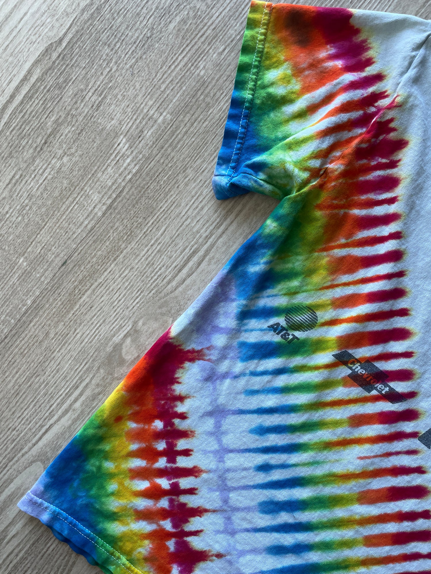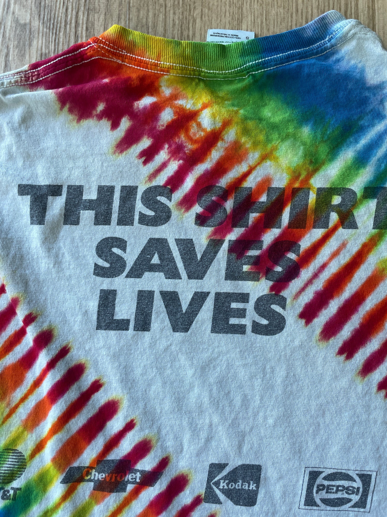 SMALL Men’s Vintage 1995 Live Aid Concert Tie Dye Short Sleeve T-Shirt | One-Of-a-Kind Upcycled Rainbow Pleated Top