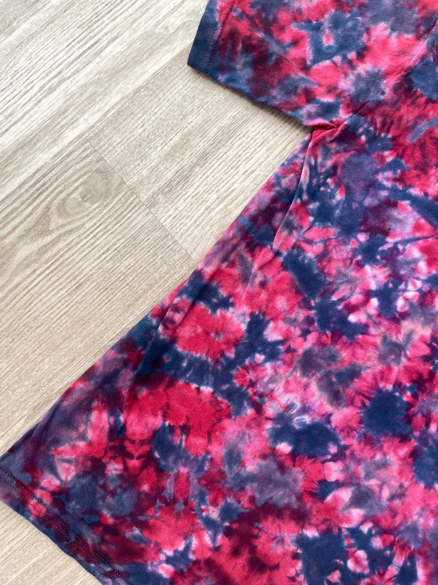 red tshirt bleached and dyed with shades of blue and purple crumpled tie dye pattern