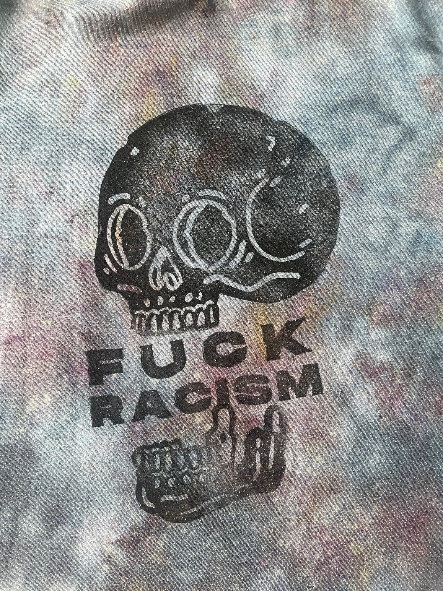 Small Men's Hand-Printed Fuck Racism Skull Galaxy Tie Dye Short Sleeve T-Shirt | Handmade One-Of-a-Kind Upcycled Black and Gray Top