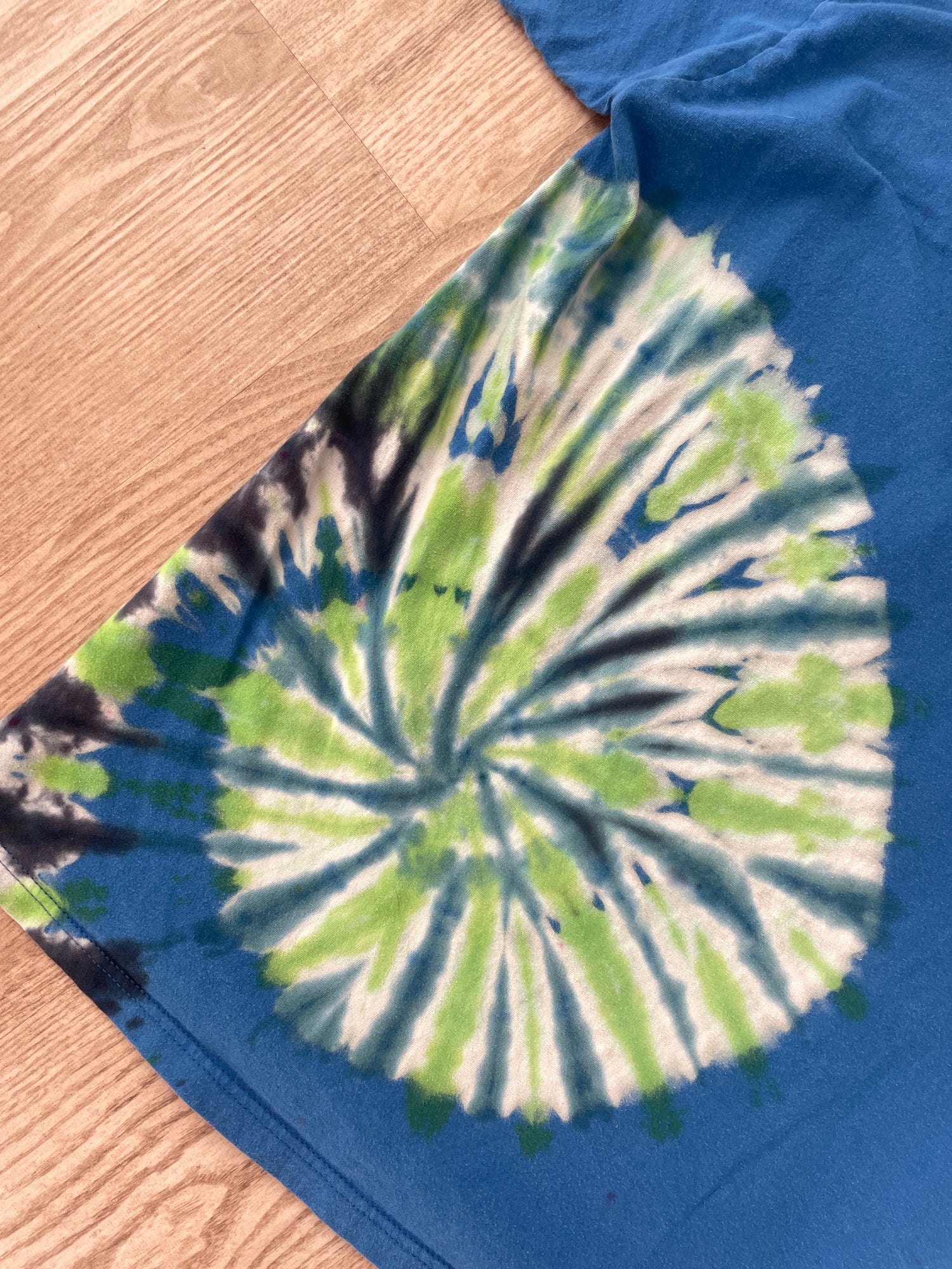 blue tshirt bleached and dyed with green and blue spiral tie dye pattern