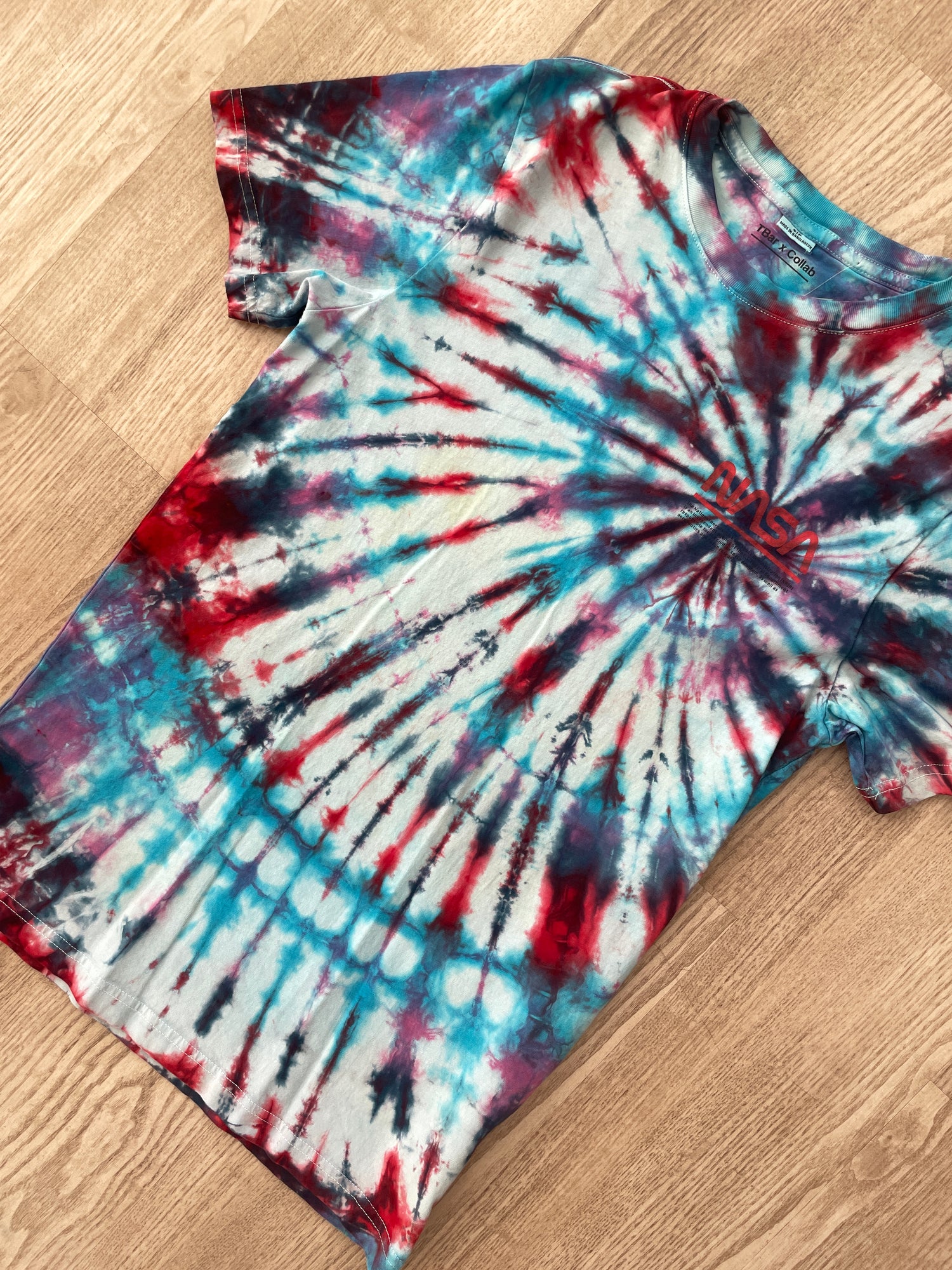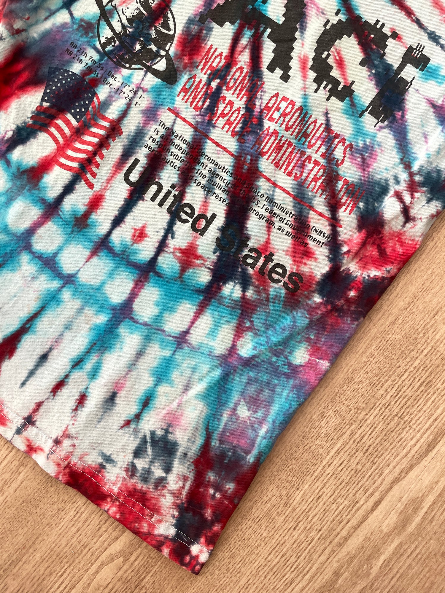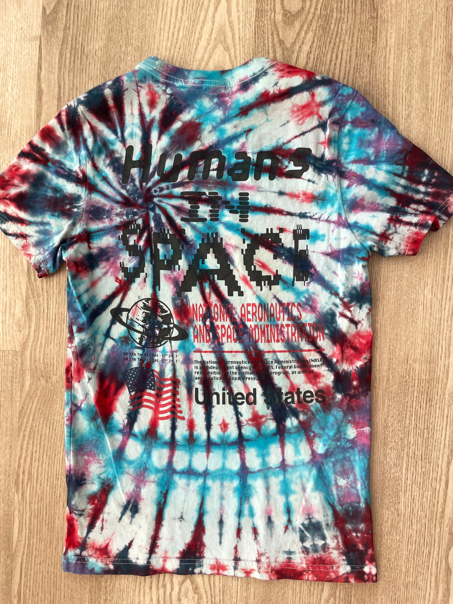 SMALL NASA Humans in Space Handmade Tie Dye Short Sleeve T-Shirt | One-Of-a-Kind Upcycled Red, White, and Blue Spiral Top