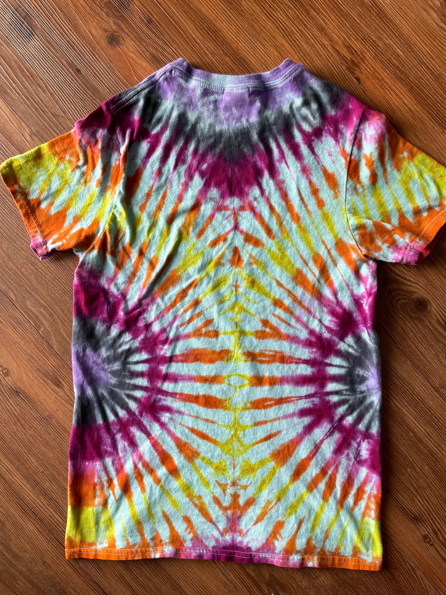 Small Women’s Floral Bicycle Handmade Reverse Tie Dye T-Shirt | Blue, Pink, and Orange Pleated Tie Dye Short Sleeve