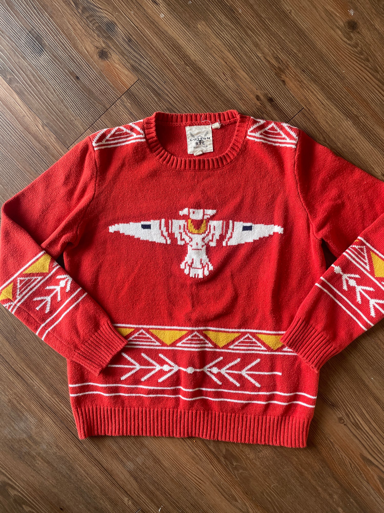 Small Women’s Red Cotton & Rye Southwestern Geometric Thunderbird Sweater