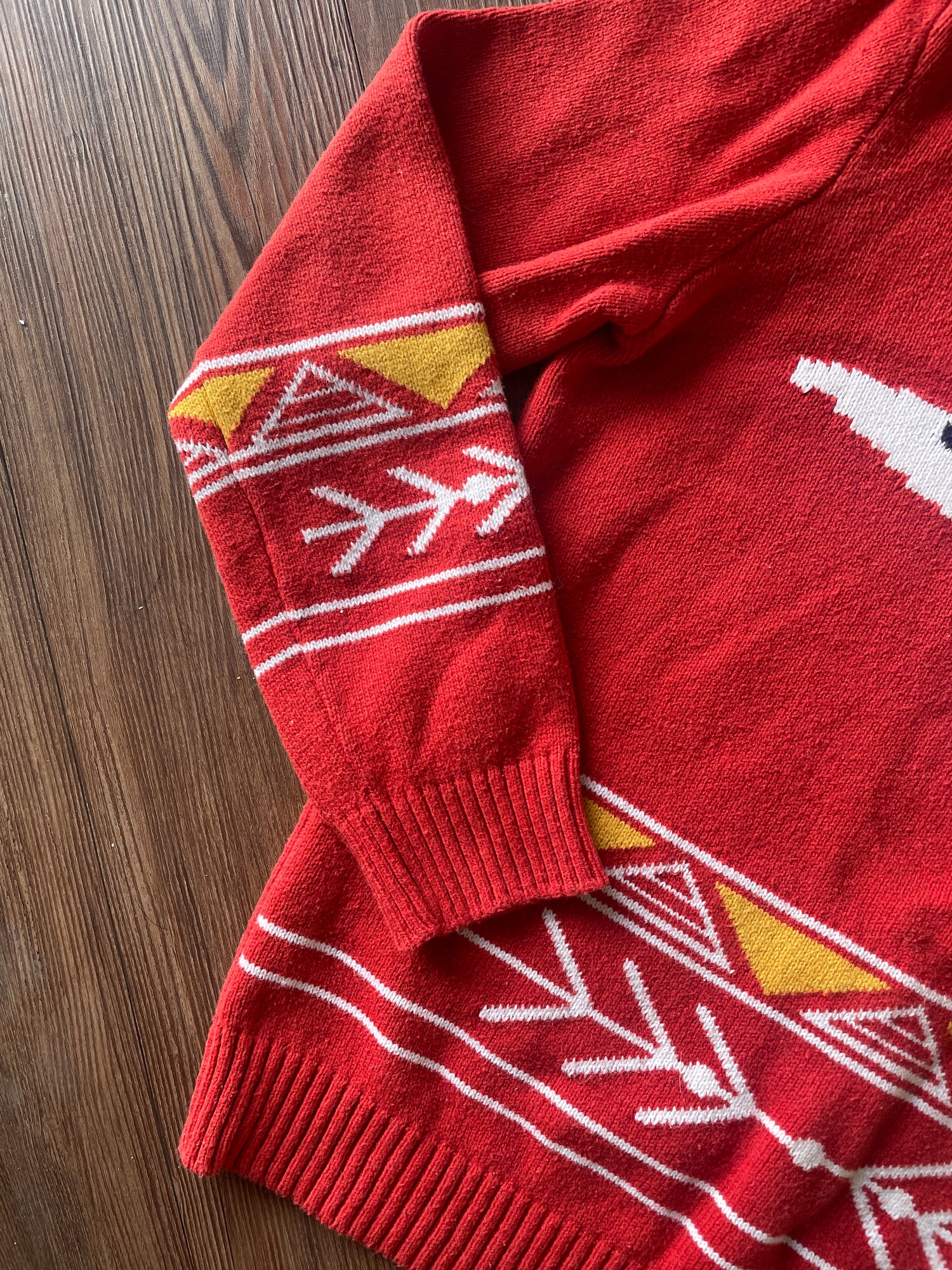 Gorgeous, eye-catching sweater. Bright red body with white and marigold thunderbird and geometric accents.