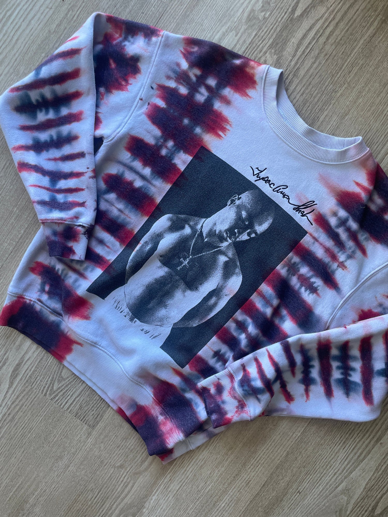 SMALL Women's 2Pac Tupac Shakur Handmade Tie Dye Long Sleeve Sweatshirt | One-Of-a-Kind Upcycled White, Black, and Red Crewneck