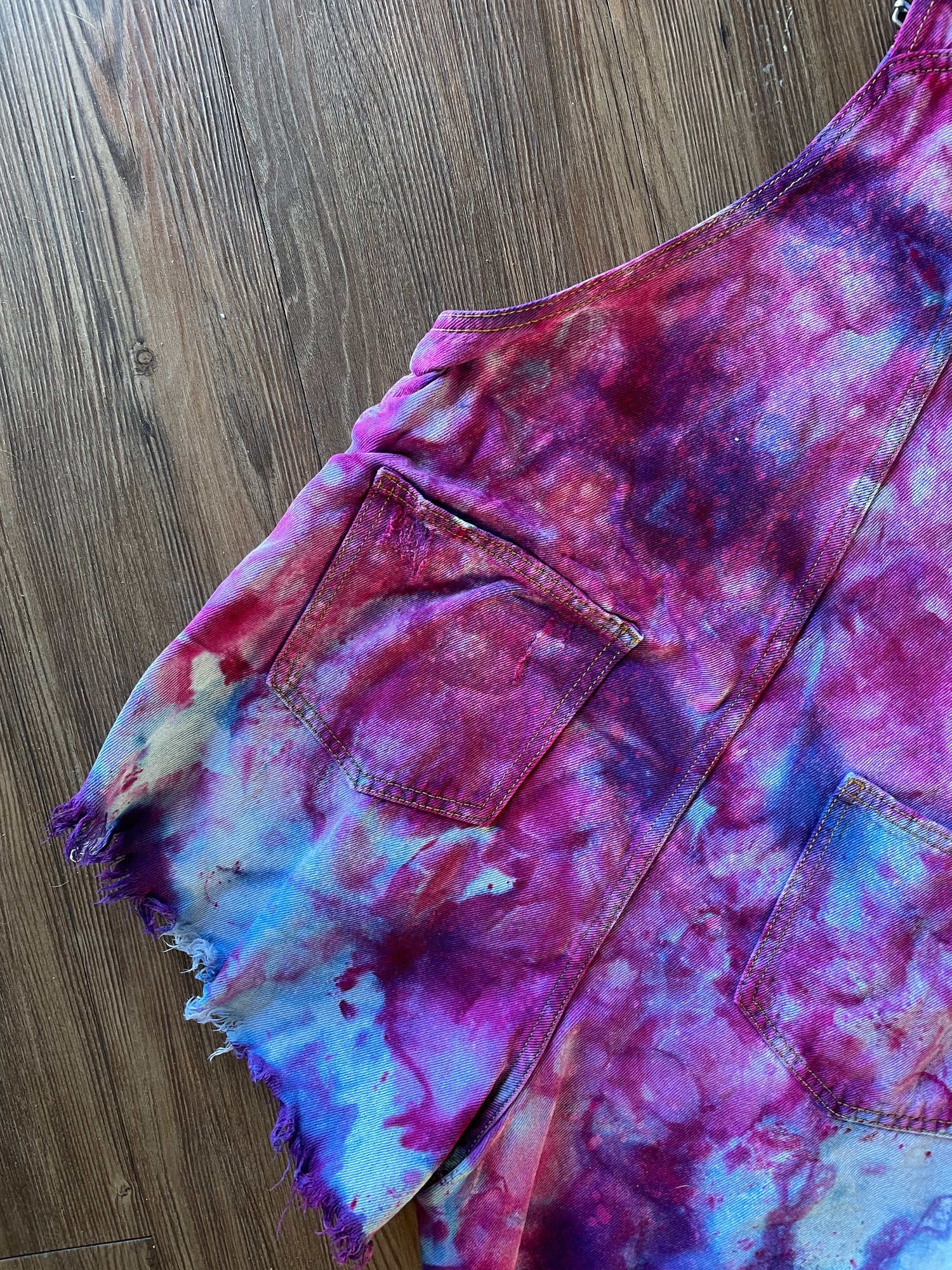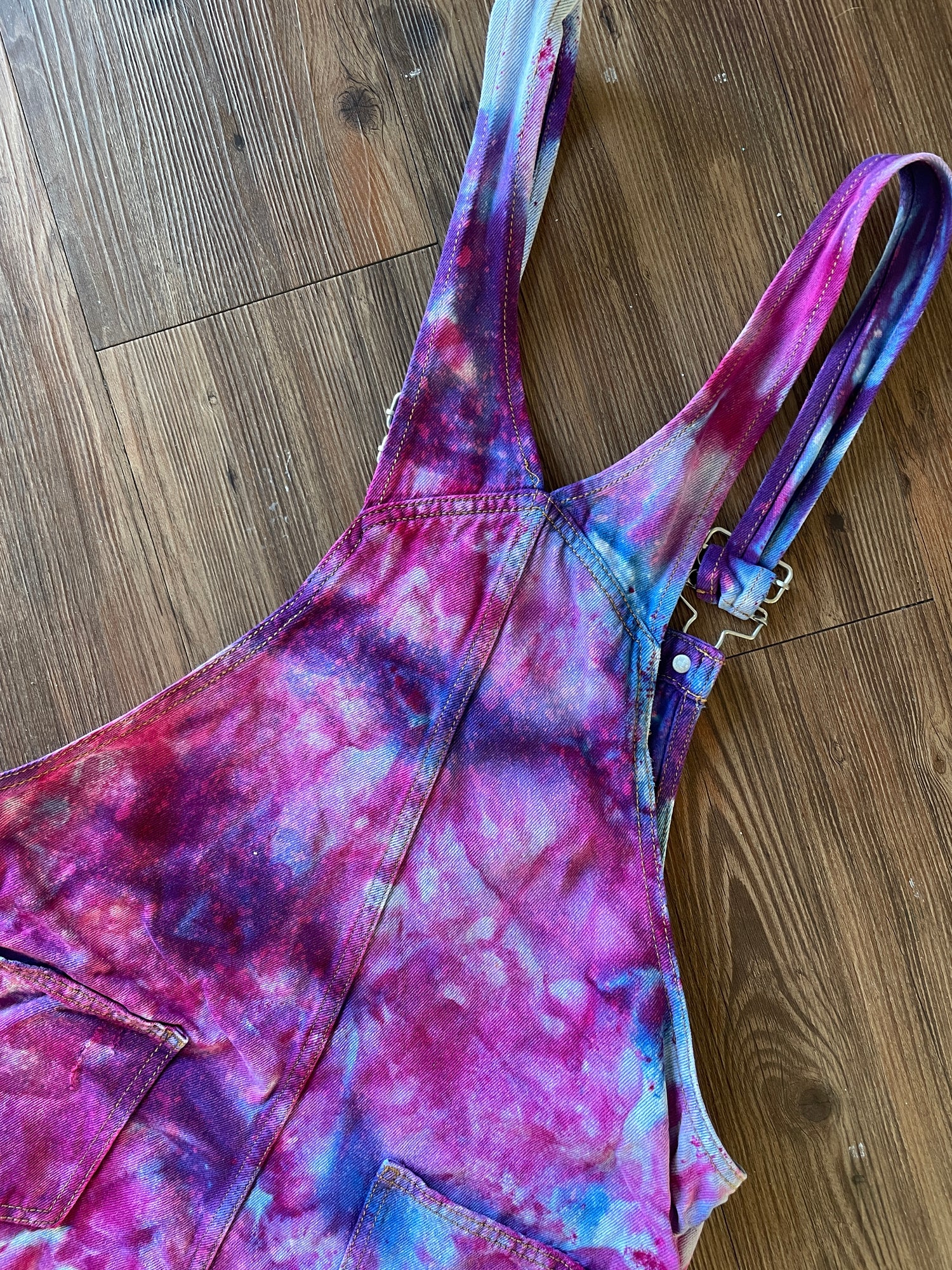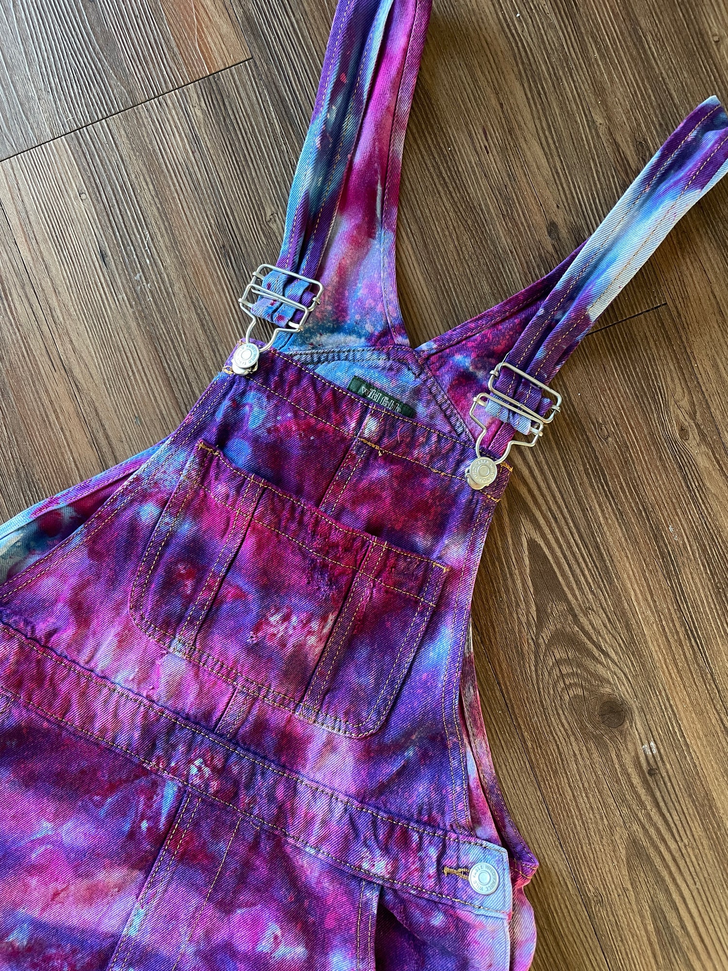 denim cut overalls dyed with blue, purple, and pink galaxy tie dye pattern