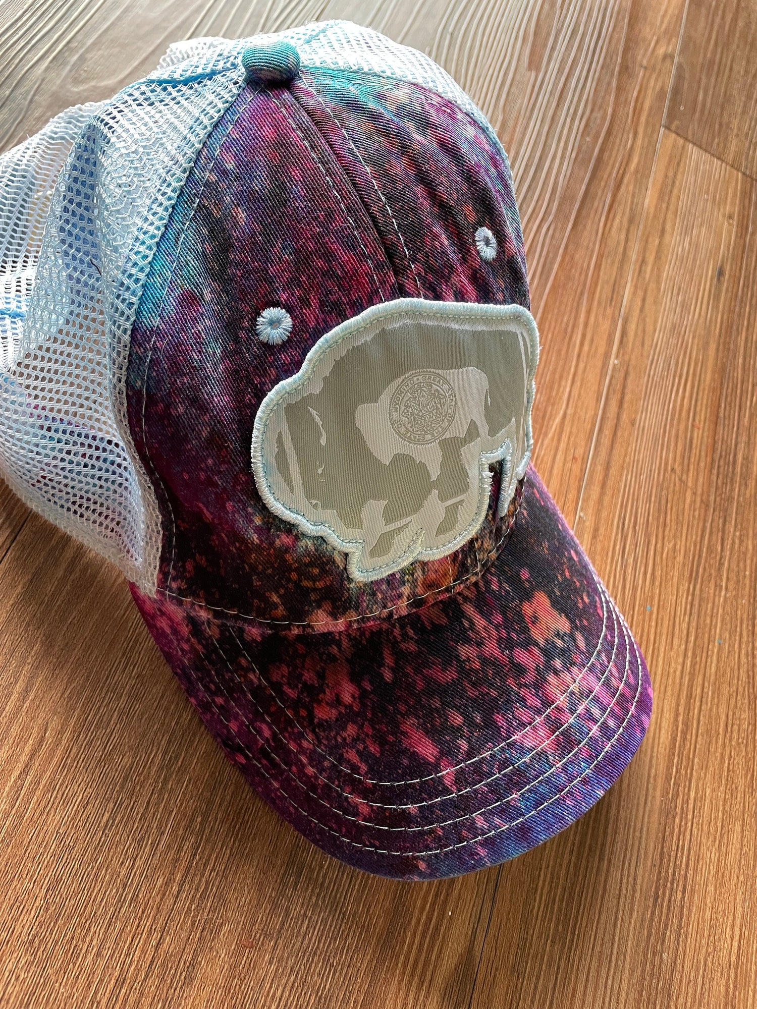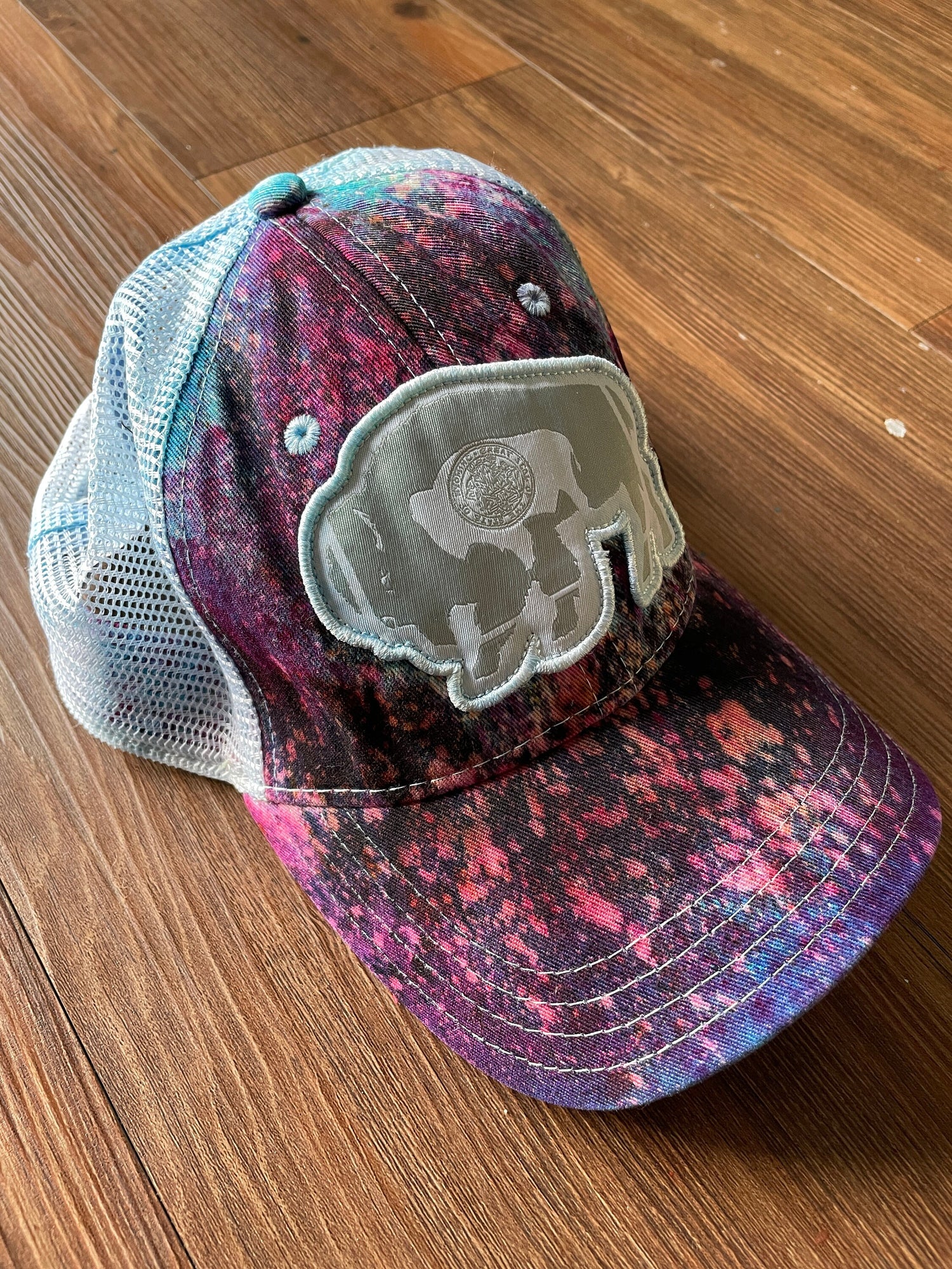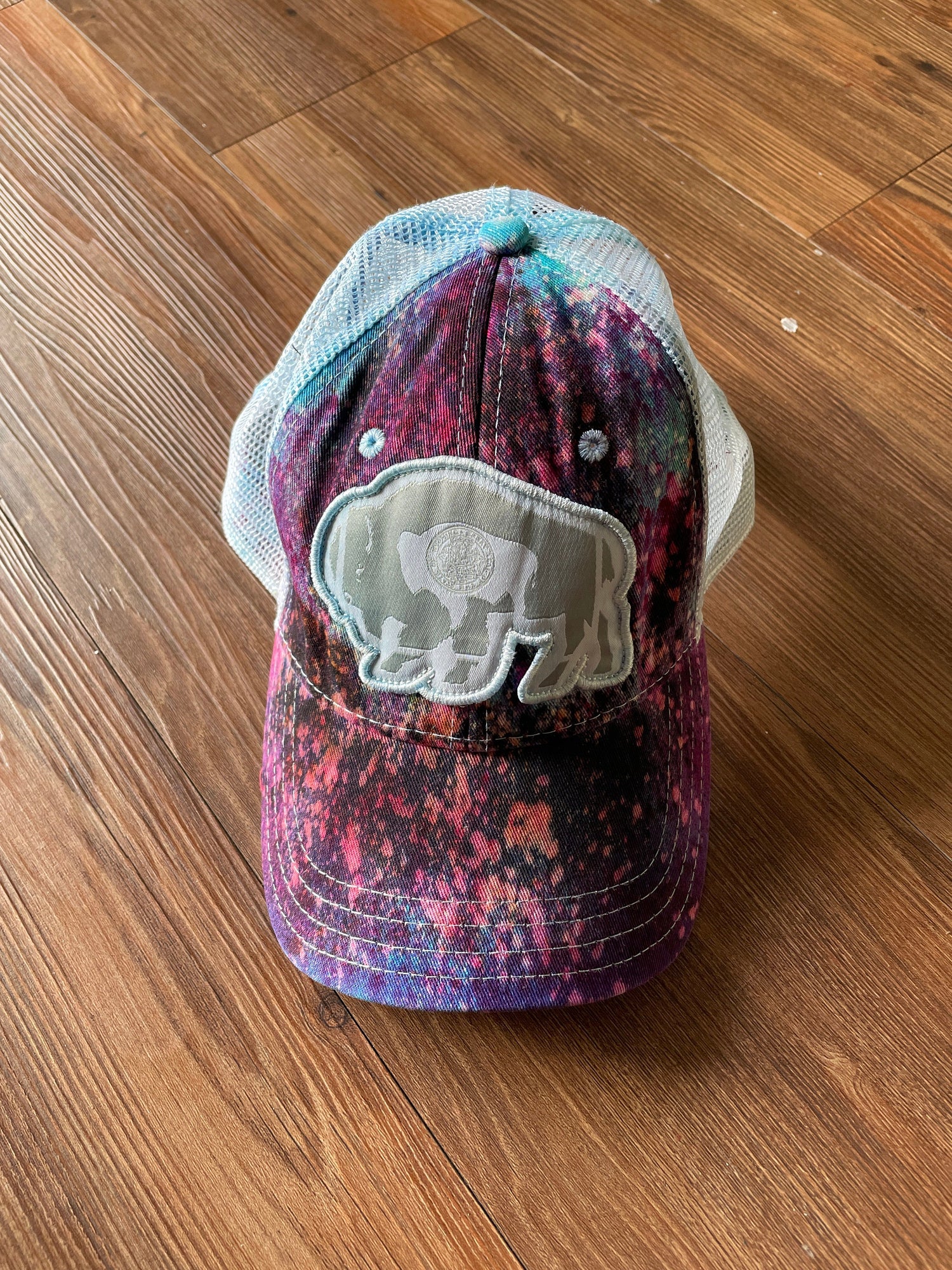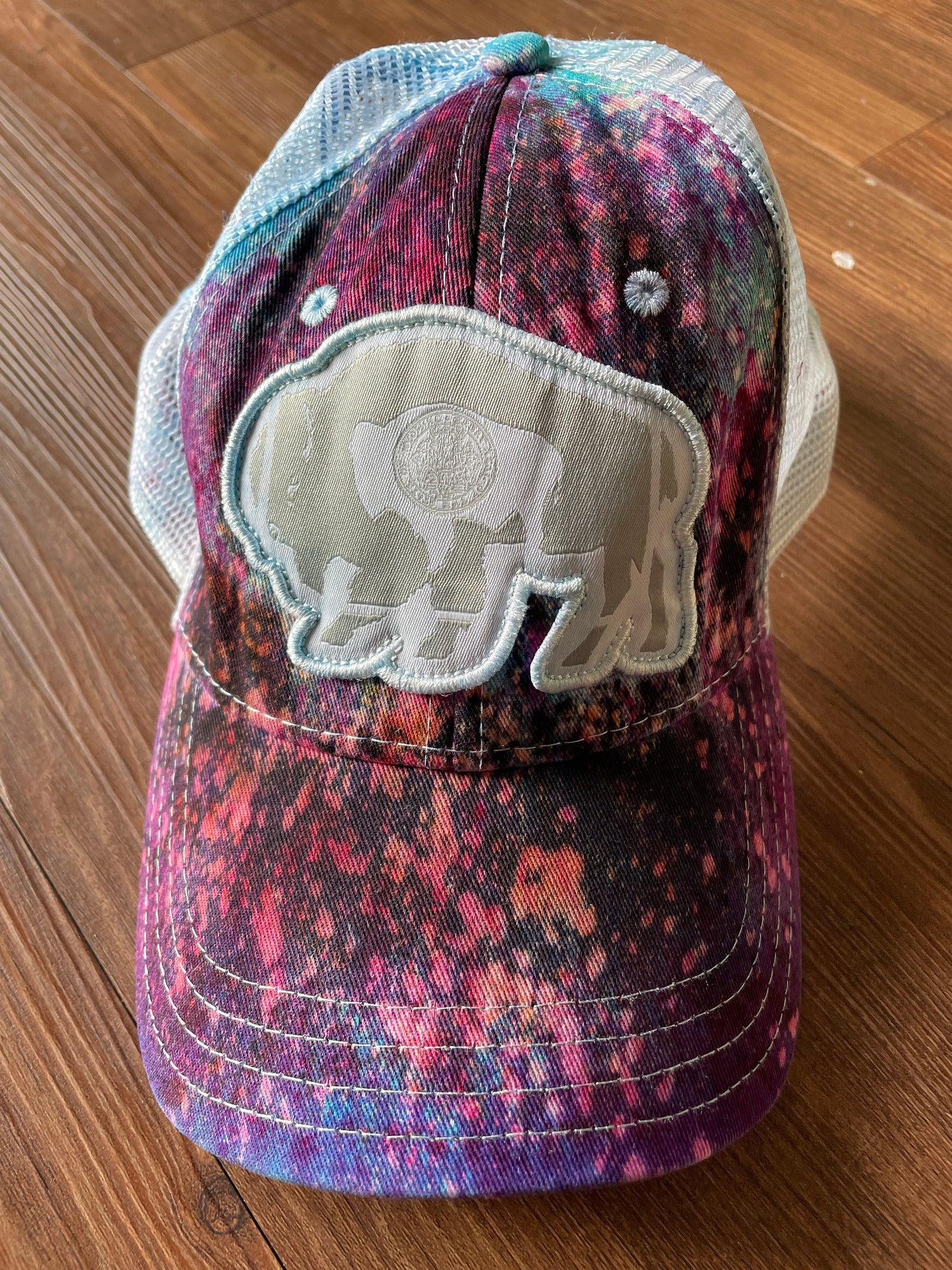 Surf Wyoming Bison Handmade Tie Dye Trucker Hat | Wyoming Flag Pink Ice Dyed Bleach Dyed Adjustable Hat | Handmade & Thrifted
