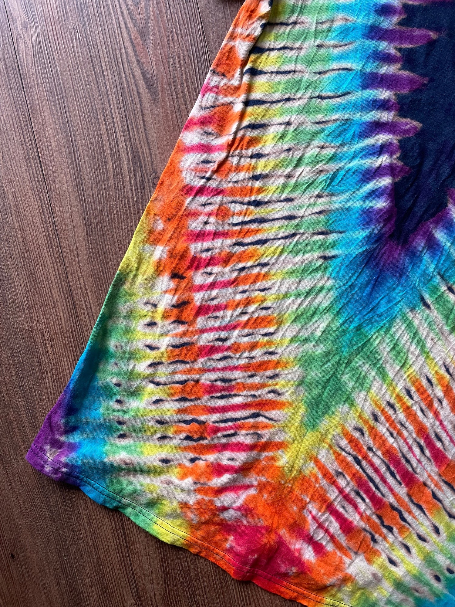navy blue tshirt with rainbow v-pleated tie dye pattern