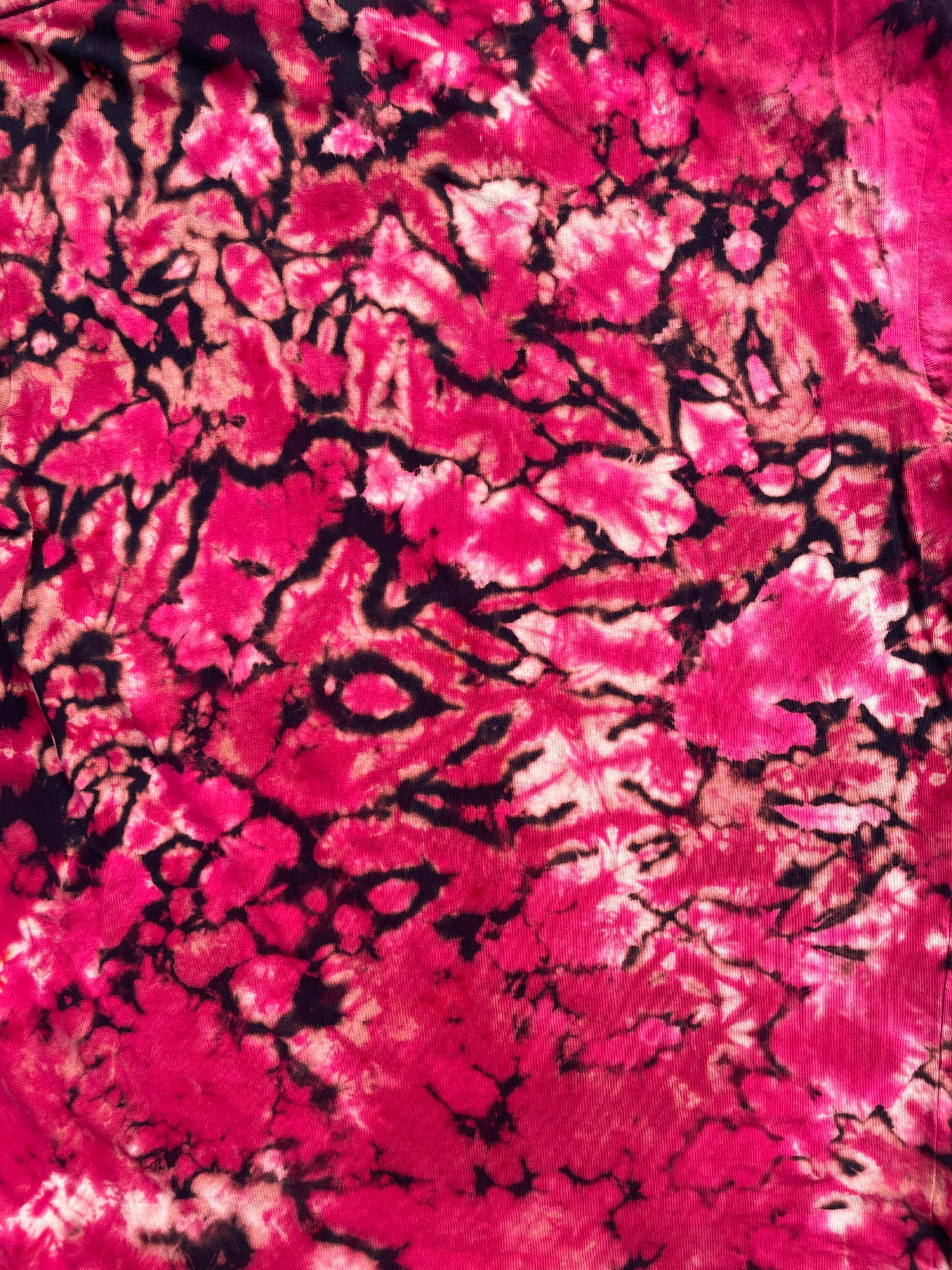 black t-shirt that's had portions of color removed and re-dyed with shades of red crumpled tie dye pattern