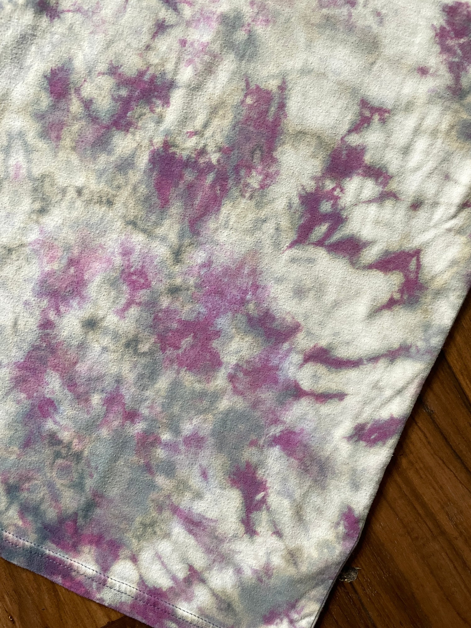 gray tshirt bleached and dyed with shades of purple and pink crumpled tie dye pattern
