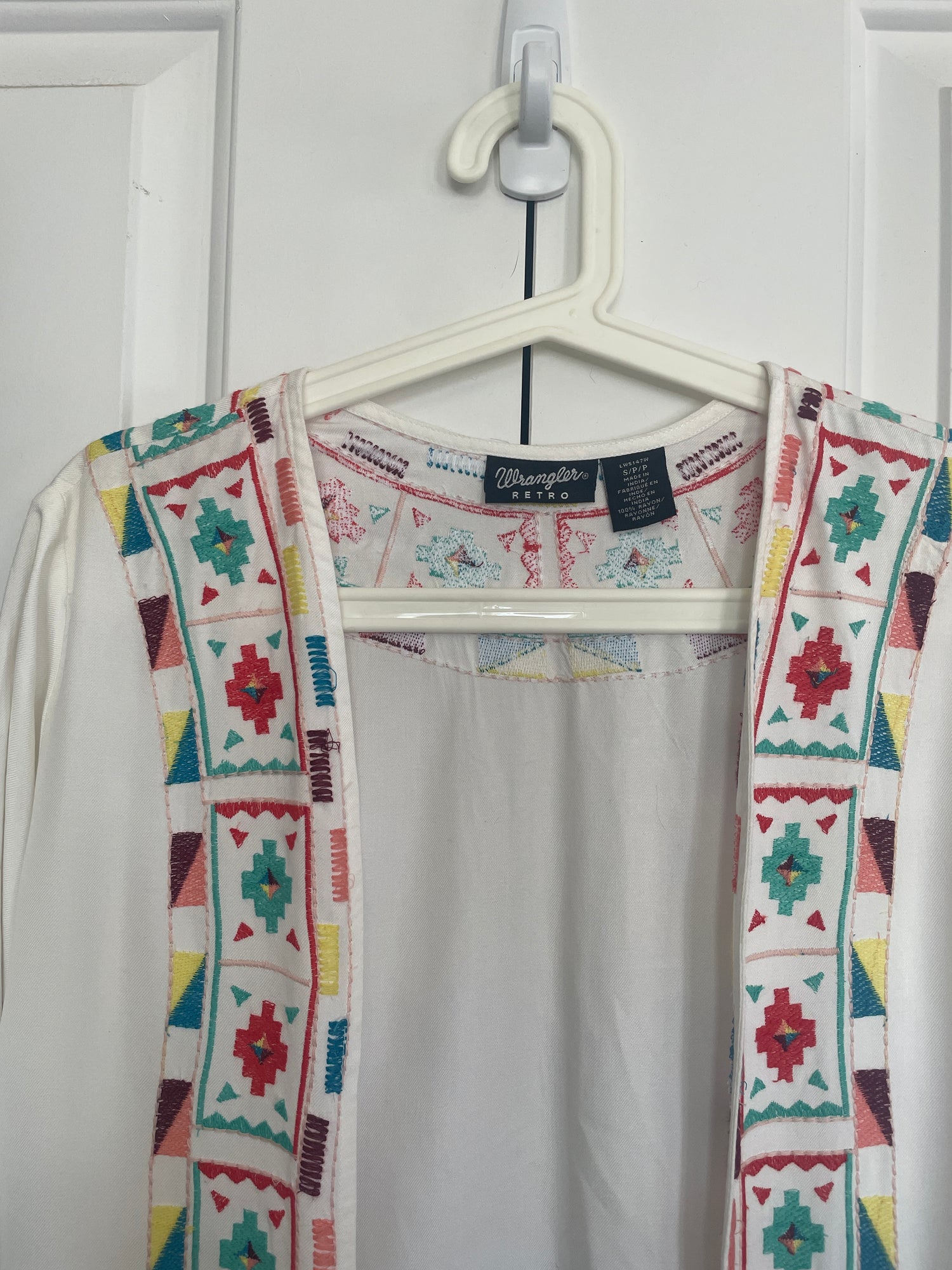 This is a gorgeous, flowy duster from Wrangler! Bright, bold vintage-inspired embroidery adds just the right amount of oomph to a long, flowy white fabric.