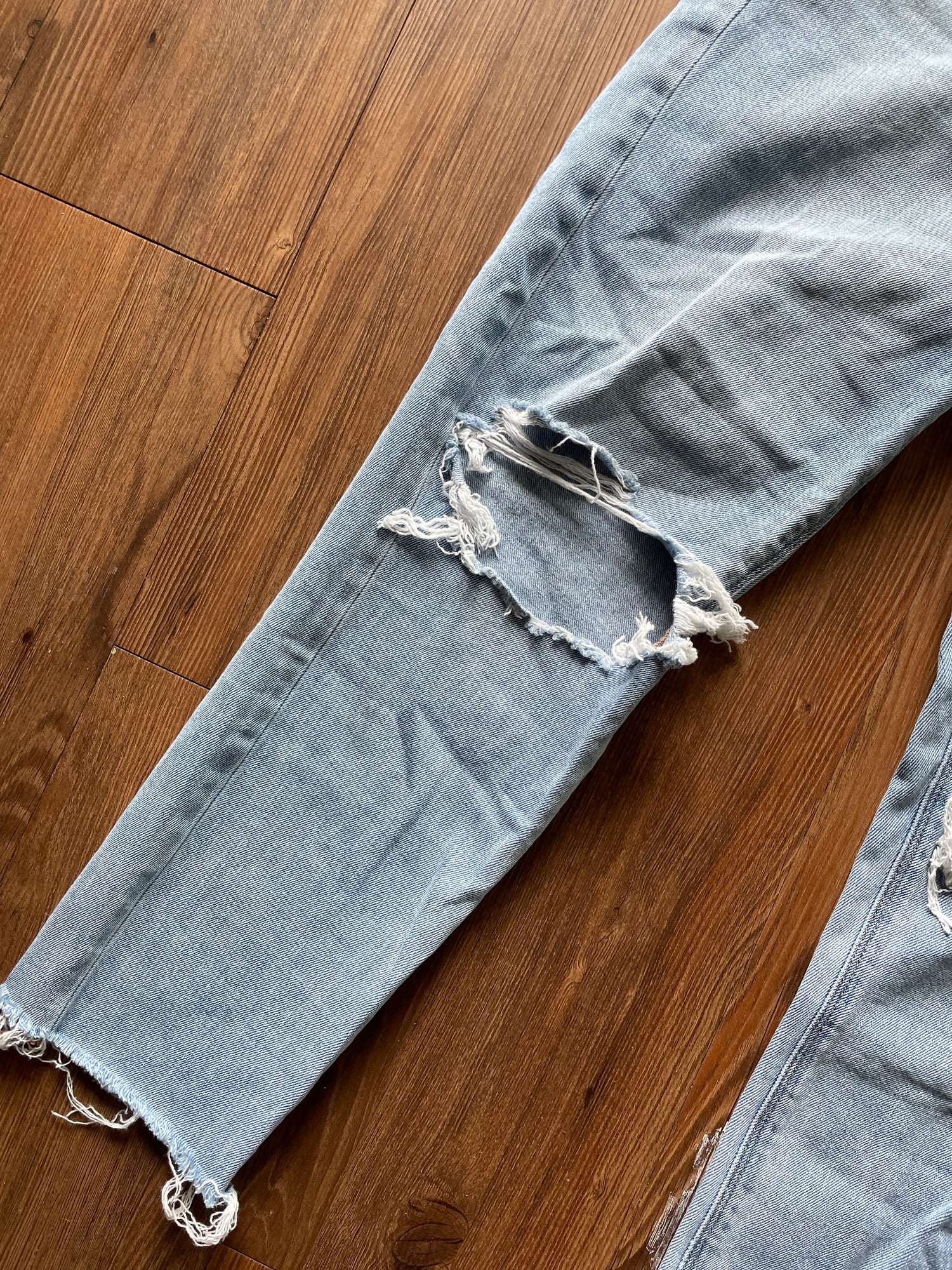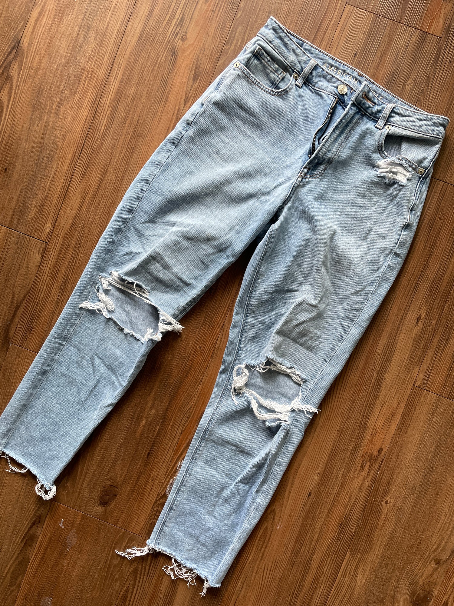 Super soft, practically new light wash mom jeans from American Eagle. Just enough stretch to keep 'em comfy all day long. Holes in both knees.