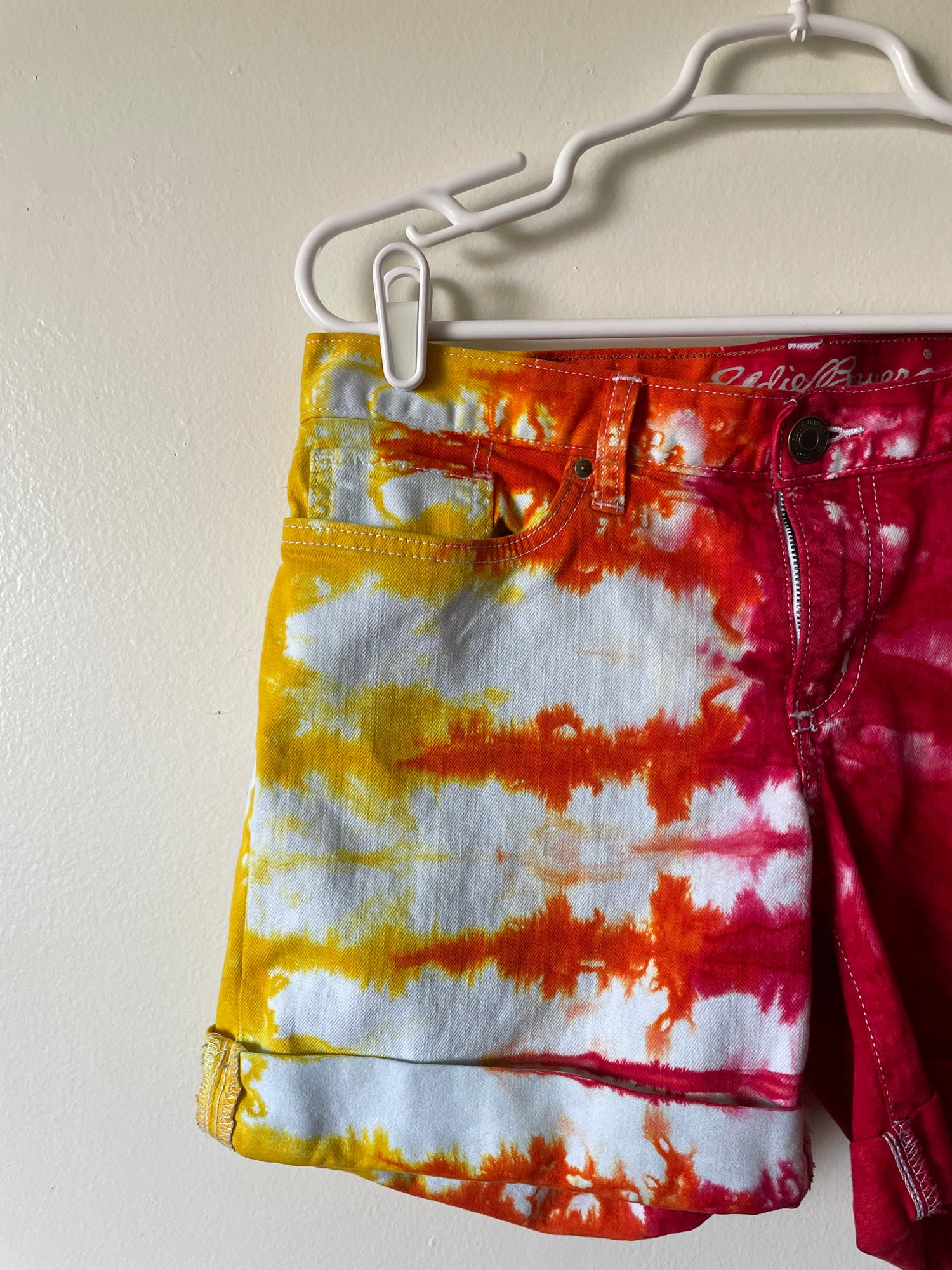 Women's Size 6 Eddie Bauer Half Red Half Yellow/Orange Dip Dye Shorts | One-Of-a-Kind Upcycled Warm Tones Sun Shorts