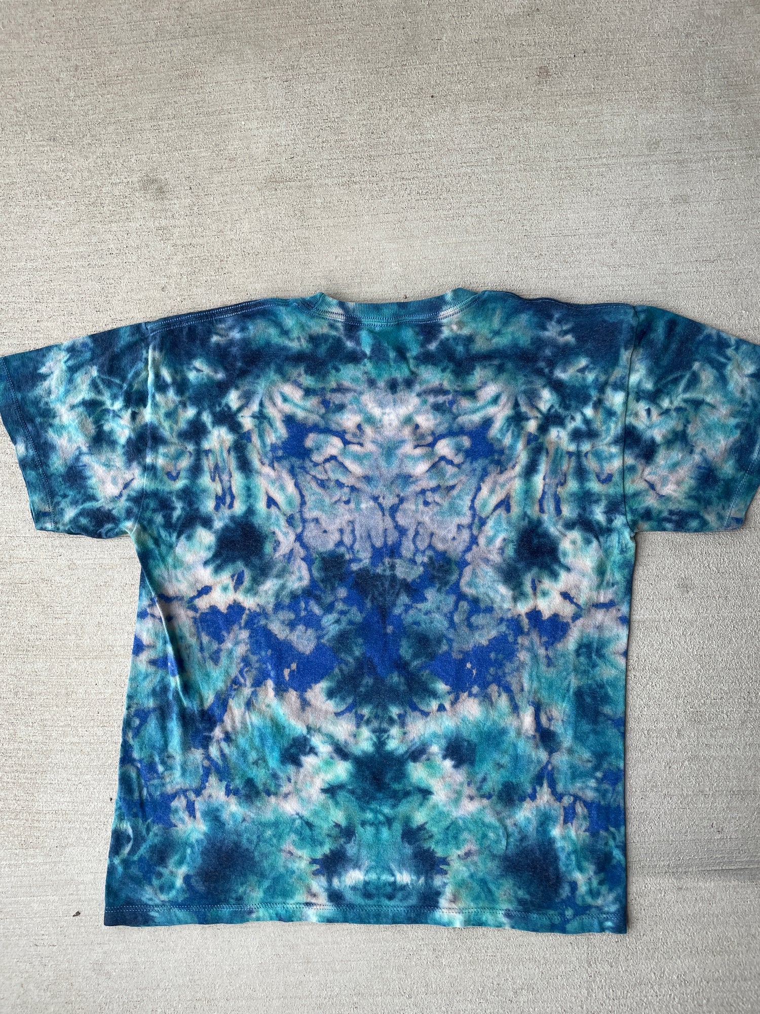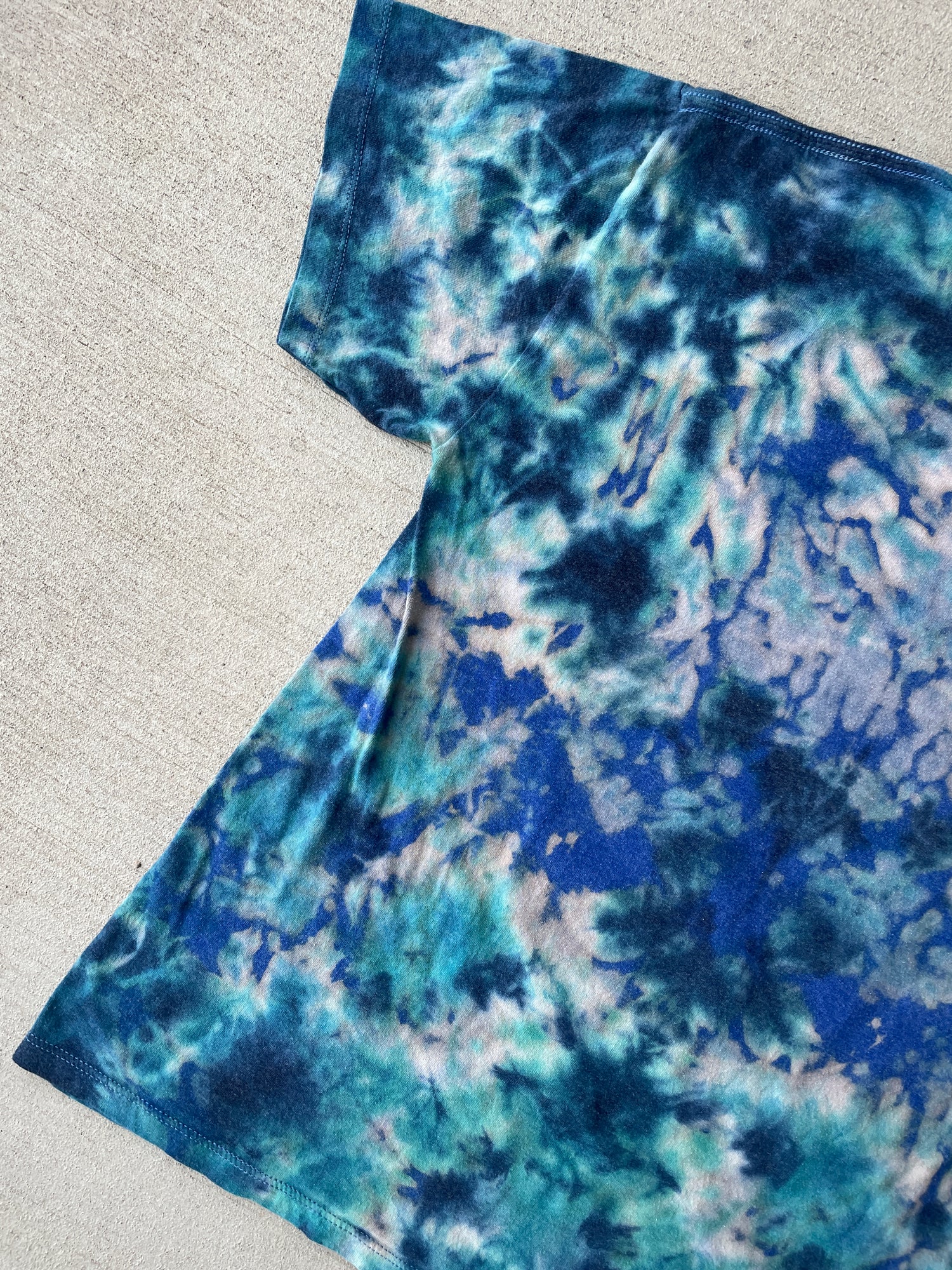 blue tshirt bleached and dyed with green and blue crumpled tie dye pattern