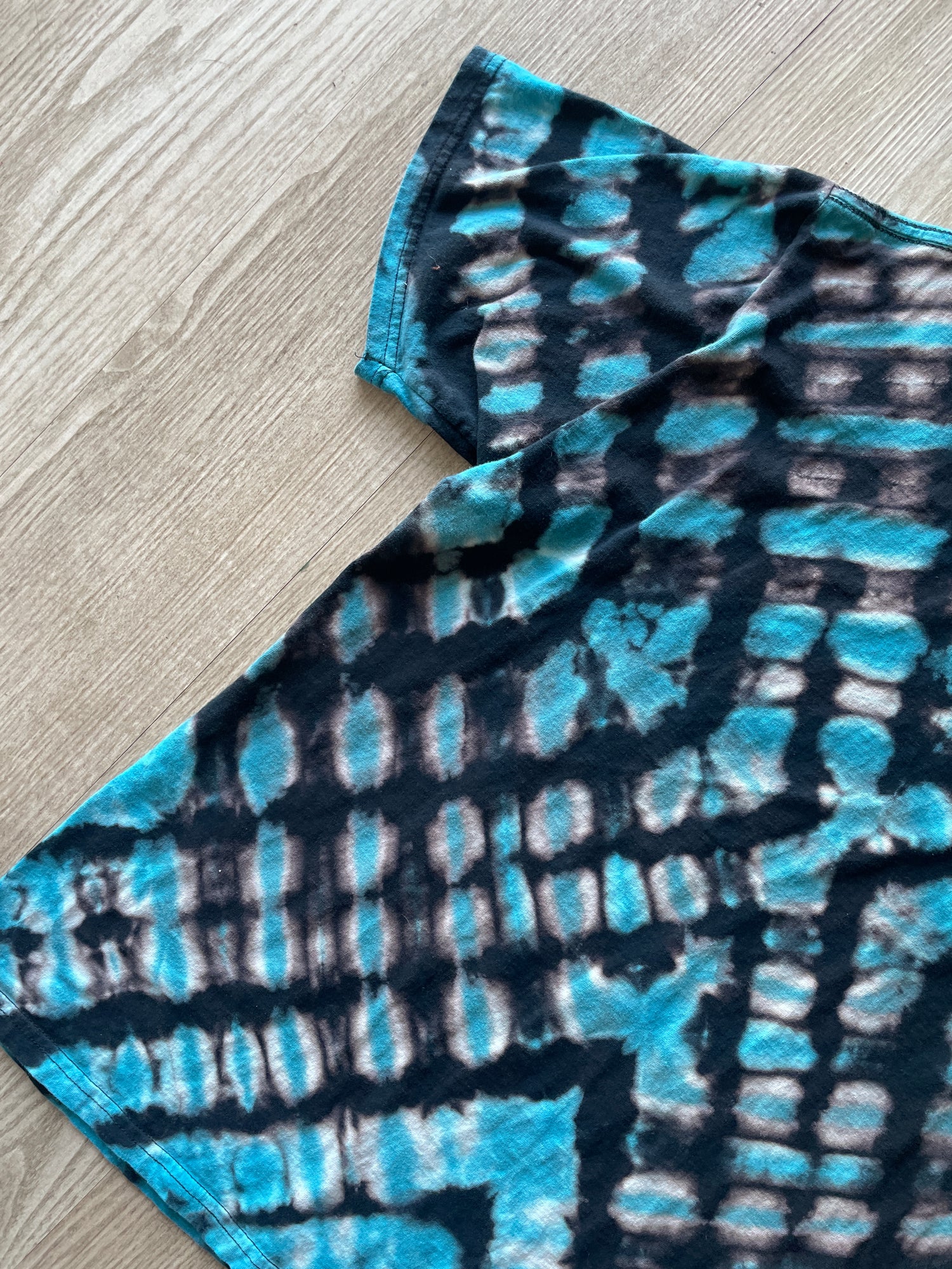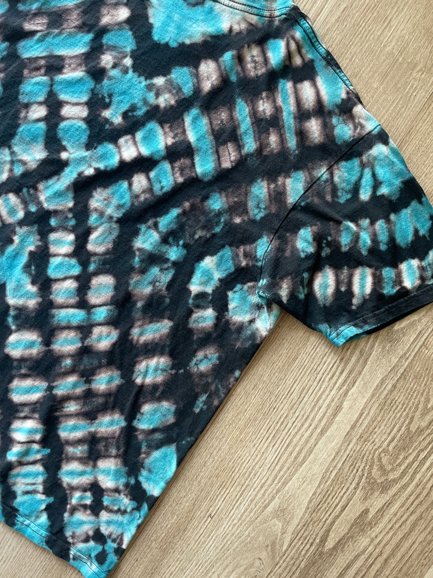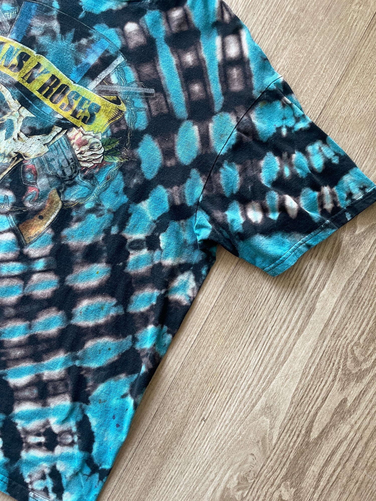 XL Men’s Guns n Roses Skull and Crossbones Tie Dye Short Sleeve T-Shirt | One-Of-a-Kind Upcycled Black and White X-Pleated Top