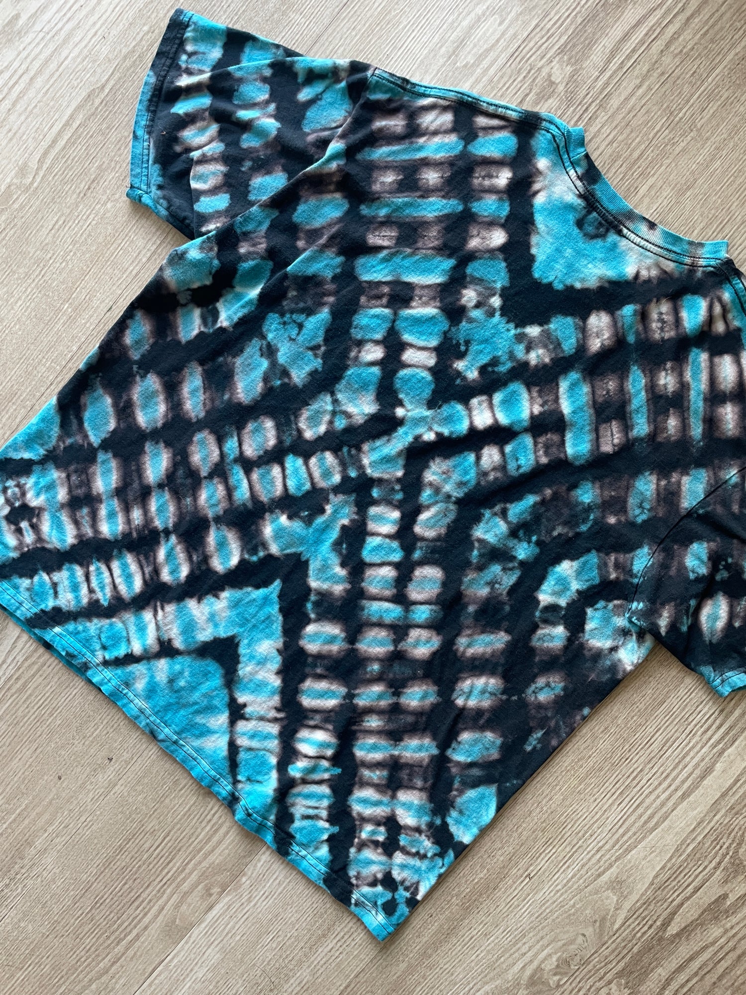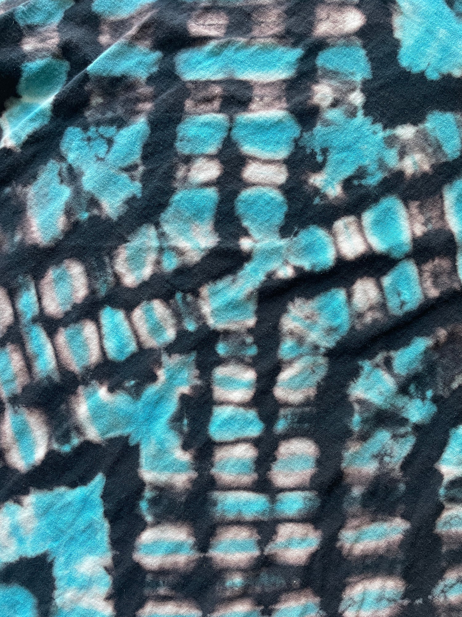 blakc tshirt bleached and dyed with blue pleated tie dye pattern